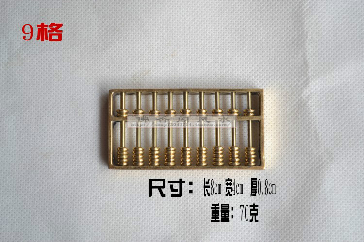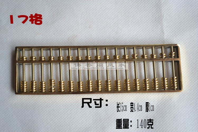 【工藝】:做工精細,純銅打造,工藝精良,表面手感細膩,只有背面放桌上的地方為增加摩擦力,沒拋過光,所以背面有少許小黑塊也是正常。 這款全銅算百分之分系純黃銅精鑄而成。在風水學上,銅算盤常用于銀行、店主、商業留易、金融、財務、公務員人員等人士旺財招財之用。可放在命主的抽屜內,另外也可以掛在門上、窗上或者書架上用于招財旺財、化煞化解小人。另外,若門外或者窗外對著電線桿,形成“六煞水”,宅主亦須立即在門外或者窗上掛一個銅算盤,以化解之。否則電線桿形成的“六煞水”會對宅主人健康及事業造成負面之影響。 |
