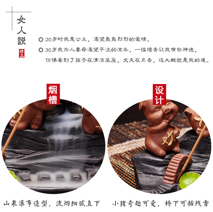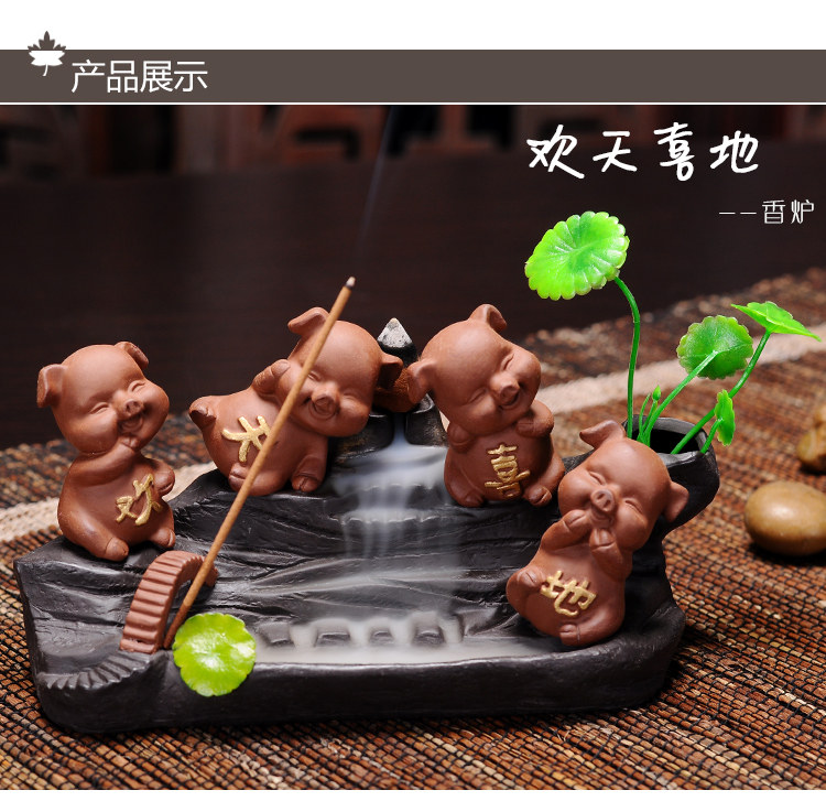 歡天喜歡地送倒流香60粒裝飾綠葉陶瓷創意可愛招財 小豬紫砂茶寵茶盤桌擺件 觀賞倒流香爐耍玩水培