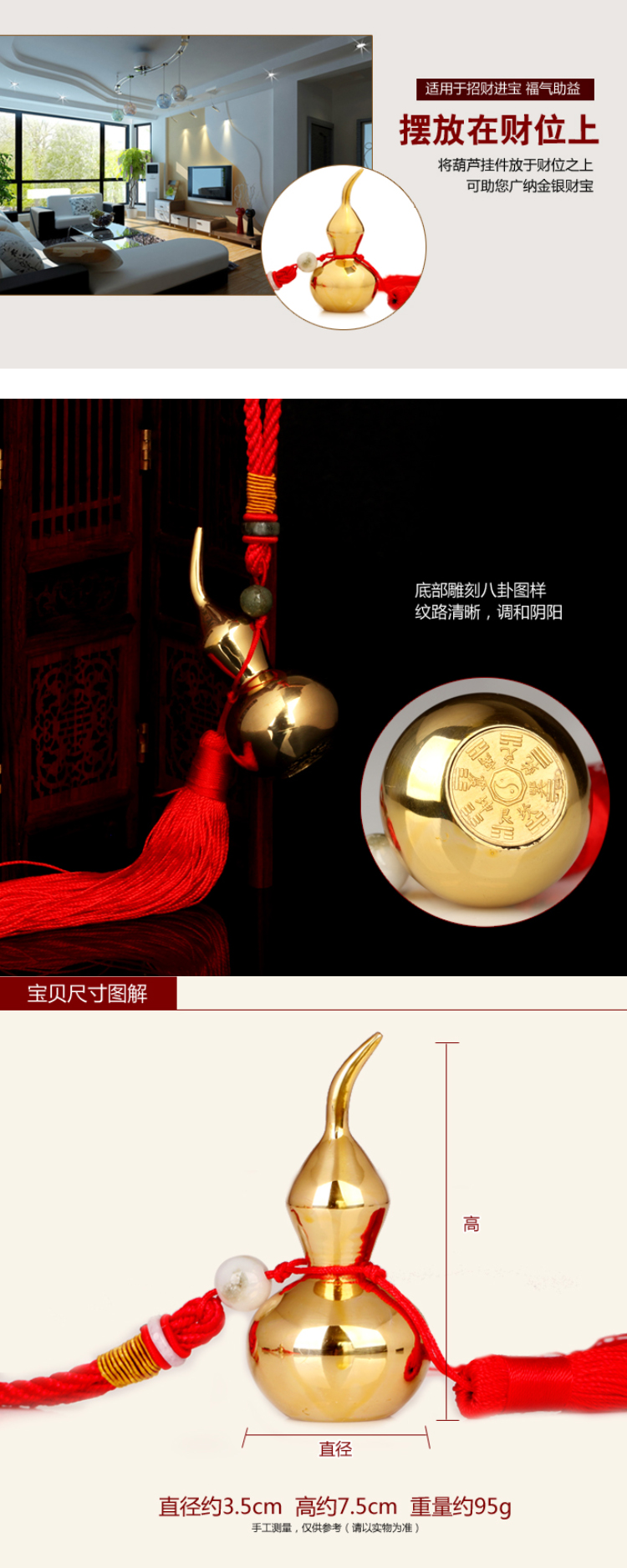葫蘆用作除病之用,只須掛在病者的睡床尾或擺放在病者的睡側。就可以吸取病人身上的病氣,使其快速的好起來.如果是健康人,可以吸走人身上的晦氣,提升運勢。 葫蘆掛在大門外,則有保屋內人平安的作用 葫蘆化病,人所共知,但銅葫蘆可添夫妻情分則甚少人知道。若夫妻緣薄,可擺放一只銅葫蘆在床頭,增加夫妻恩愛。另外,凡家中有病人,可擺放此法器,對健康有利,家有小孩及長者更應選用。此物在一定程度亦可化煞擋災,用途廣泛。