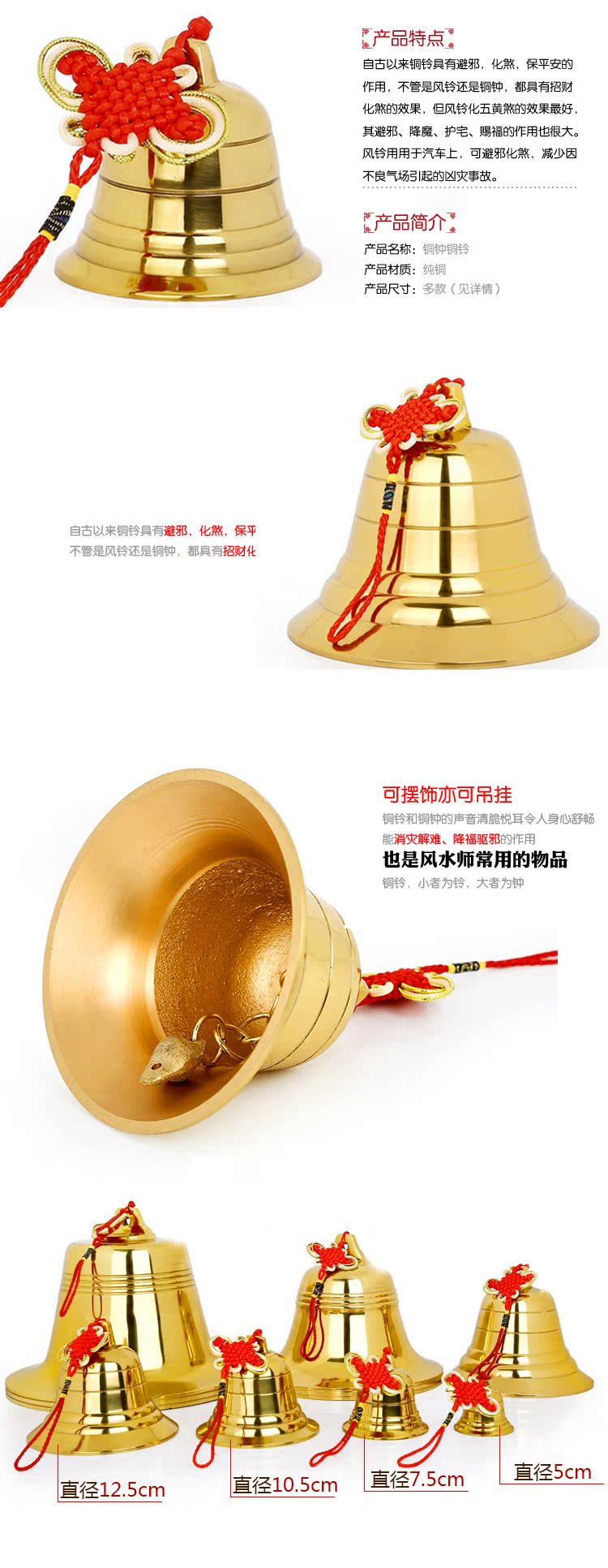 此 款平安銅鐘,可擺飾亦可吊掛,聲音清脆悅耳令人身心舒暢;能消災解難.驅除邪魔.化解煞氣.居財.引財.化煞為財.掛店門口事業順利-財源廣進,化解諸損 害;屬風水化解物...對陽宅有改變磁場.化解煞氣.能讓居家風水達到趨吉避兇之效果. 可招財,所以可安于財位或煞位。也可收藏在聚寶盆。