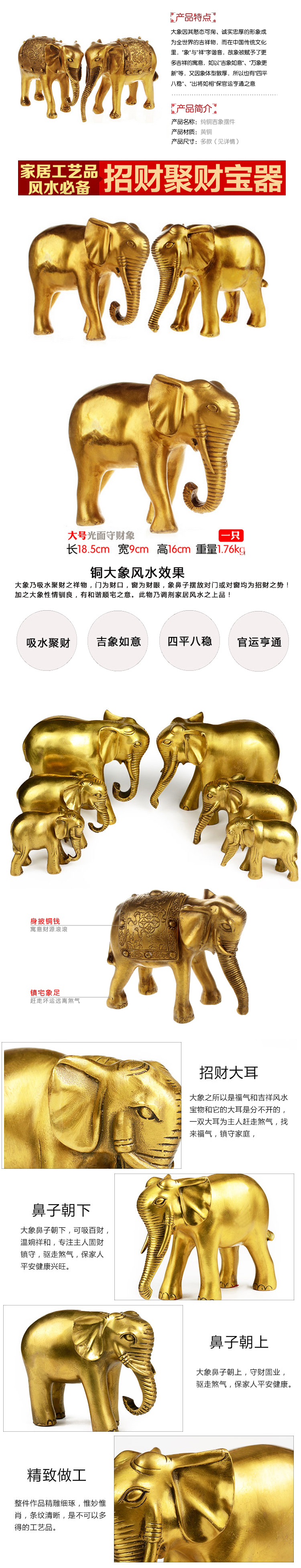 作用: 傳說象為北斗七星之中“搖光之星”化身,能預兆吉兇。“象”諧音“祥”,象征吉祥、祥瑞、和平。大象向來被視為風水吉祥物,象鼻向上的《噴水象》可帶來歡欣,象鼻向下的《吸水象》則可以聚財,兩者均非常適合擺放于家中。 象 鼻向下的“吸水象”有聚財、催財之功效。在風水中水為財,凡家居大窗見海或水池,均稱為“明堂聚水”,則可擺放大象在家中,象鼻向外,造就大象吸水為財之 象,則大財小財均為己所納,令財源滾滾而來。如窗外沒有水源,可在象前放一盆水植物或魚缸,效果一樣。此象之稟性馴良,放在宅中吉祥如意。如將之放在室內 財最盛的地方,則全家受惠。 另外,在家里擺放大象飾物,可以起到吸旺氣加強座方之力量的功效.一般建筑的風水喜歡有靠山,所謂"前方有照,后方有靠";而大象體積墩厚,如山一般,于坐方擺放象飾,便于加強坐方的力量,若屋后無山或者依靠物,應請象入室!! 化解陰煞:特別是若家中廁所或浴室對臥室或大門,可用此寶器化解。浴廁對大門,這在風水學中為忌。凡家宅遇此情形,主家中之人健康不佳,易生難以治愈的慢性疾病,并主家中男主人事業上有阻。化解之法:將此銅象安放在浴廁中既可。 |