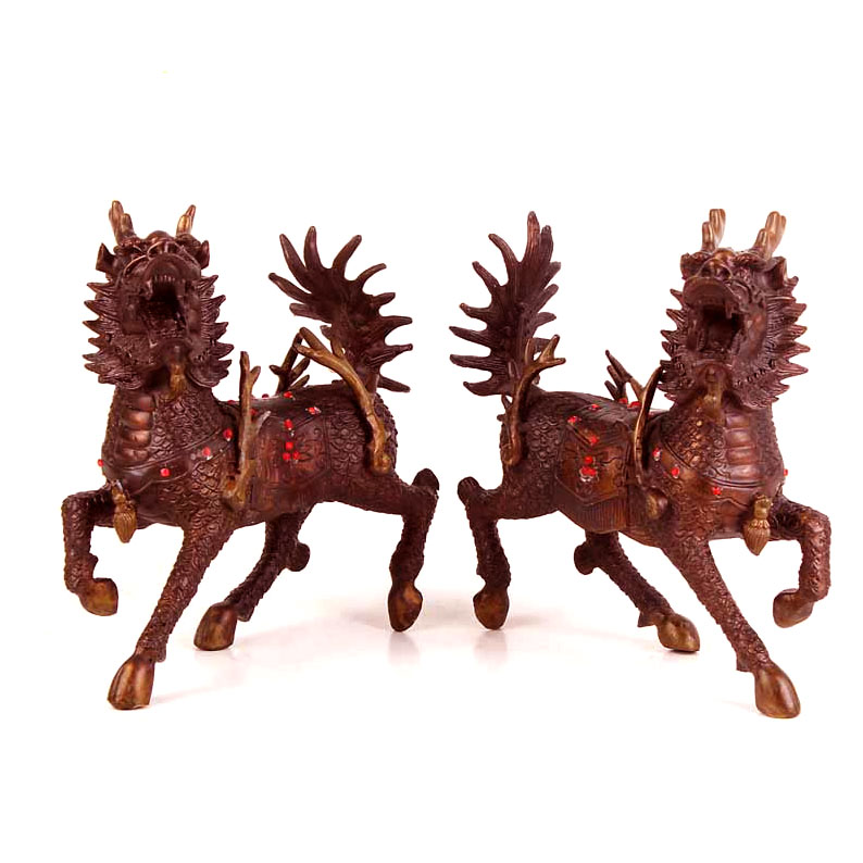 麒 麟是集龍頭、鹿角、獅眼、虎背、熊腰、蛇鱗、馬蹄、豬尾于一身,乃吉祥之寶,從古到今都是公堂上的裝飾,以振官威之用,也是權貴的象征。能夠消災解難,驅 除邪魔,鎮宅避煞,催財升官。麒麟非常適合工作性質穩定的人擺放,特別適合在政府機關、公檢法、行政機關工作的公職人員使用。