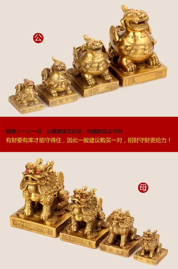 貔貅默認一對是一公一母一個單角一個雙角,單角送一串2.4厘米五帝錢,雙角送一串2.4厘米六帝錢,單角和雙角花紋和大小略有差異不同 【貔貅的作用】 貔貅在風水上的作用,可分以下幾點說明: 一、有鎮宅辟邪的作用,將貔貅安放在家中,可令家中的運轉好,好運加強,趕走邪氣,有鎮宅之功效,成為家中的守護神,保合家的平安。特別是對于幼兒更具助益。 二、有趨財旺財的作用,尤對偏行、收入浮動者有奇效,例如、經商、外匯、股票、金融、彩馬、期貨、房地產等等。除助偏財之外,對正財也有幫助,所以做生意的商人也宜安放貔貅在公司或家中。 貔貅有公母之分 , 民間傳說公的貔貅代表財運,而母的貔貅則代表財庫,有財要有庫才能守得住 , 因此擺放貔貅大多都擺放一對, 一公一母,才能夠真正的招財進寶。 -|-_-|- |