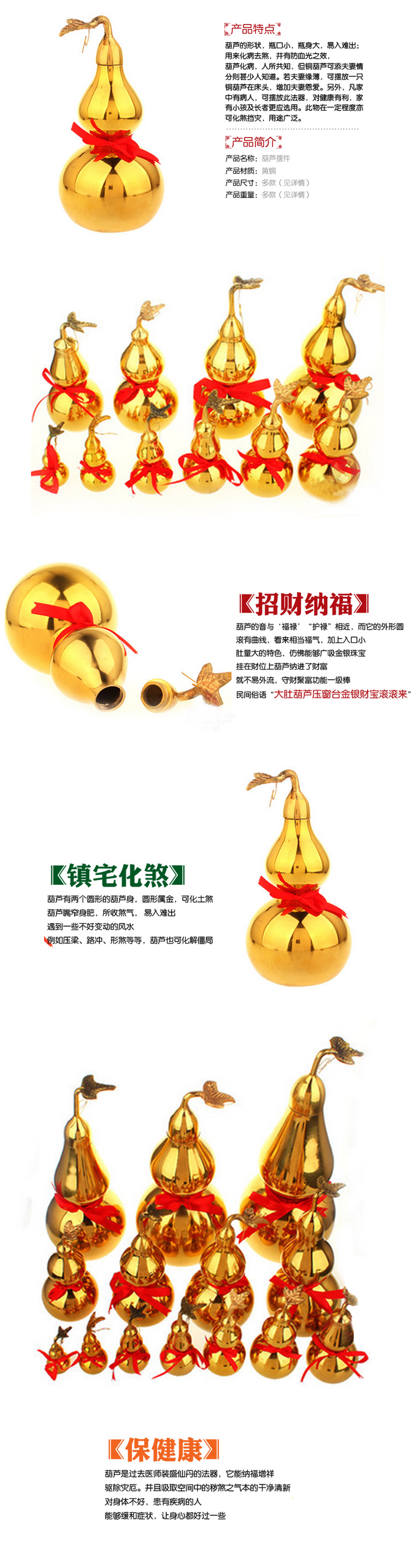 作用:葫 蘆化病,人所共知,但銅葫蘆可添夫妻情分則甚少人知道。若夫妻感情不和或感情出現危機,可擺放一只銅葫蘆在床頭,增加夫妻恩愛。另外,凡家中有病人,可擺 放此法器,對健康有利,家有小孩及長者更應選用。此物在一定程度亦可化解煞氣,抵擋災氣,風水用途很廣,也是一件風水效力很強的法器。 安放:根據具體需求安放或者在風水老師的指點下安放. 【作用】 1.求感情夫妻感情淡薄,經常為小事爭執,這樣的家庭會經營的很辛苦,要增進夫妻感情,葫蘆能派上很大的用場。方法:準備葫蘆一對,請放在主臥的床頭或者床頭柜上,可增進夫妻恩愛,對促進家庭和樂,甚至生育能力都有不錯的助益。 2.招福祿葫蘆音近“福祿”,而外型圓滾有曲線,看起來相當福氣,加上入口小,肚量大的特色。仿佛能夠吸金納銀。葫蘆納進了財富,就不易外流,守財聚富功效強。民間俗有:大肚葫蘆壓窗臺,金銀財寶滾滾來。是對葫蘆招福祿最好的注解。 3.保健康葫蘆是過去醫師裝盛仙丹的法器,它能納福增祥,驅除災厄。并且吸取空間中的穢煞之氣,恢復原本的干凈清新,對身體不好,患有疾病的人,能夠緩和癥狀,讓身心都好過一些。 4.化煞氣遇到受限于既定格局,不好變動的風水。例如壓粱,路沖,形煞等。葫蘆也可以化解僵局。起到一定的作用。 5.保平安把葫蘆掛在汽車后視鏡或者機車龍頭上,對行車平安很有幫助。 【寓 意】葫蘆是中華民族最喜愛的吉祥物之一,人們常用來避邪、去病、招寶。每個成熟的葫蘆里葫蘆籽眾多,使人聯想到“子孫萬代,繁茂吉祥”;葫蘆諧音“護祿” “福祿”,加之其本身形態各異,造型優美,給人以喜氣祥和的美感,古人認為它可以驅災辟邪,祈求幸福,使子孫人丁興旺。葫蘆還象征著和諧美,寓意著夫妻 互敬互愛。可以擺放在床頭,增加夫妻感情。葫蘆還用作除病之用,古人認為可以吸取人身上的晦氣,提升運勢。因此,千百年來,葫蘆作為一種吉祥物和觀賞品, 一直受到人們的喜愛和珍藏。 |