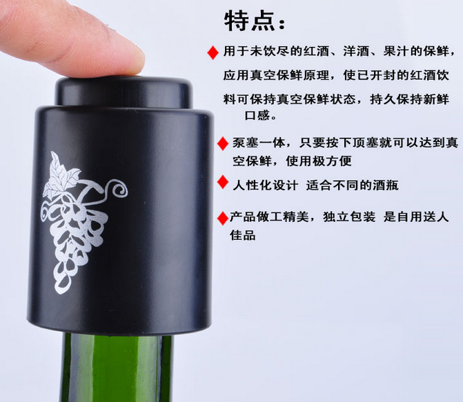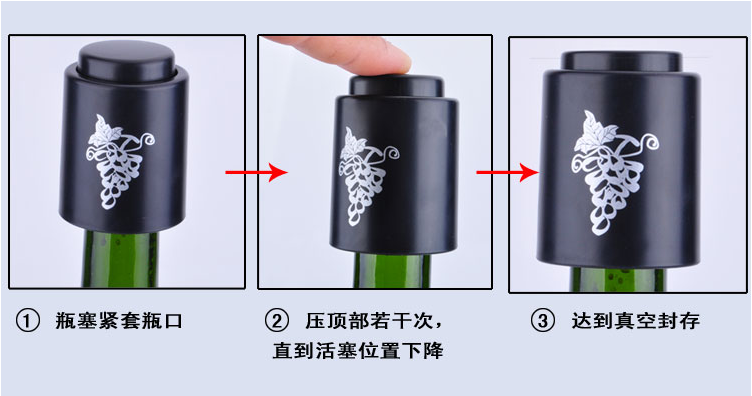 【使用方法】1、將真空抽洗凈擦干,塞在酒瓶口上,向下壓緊;2、用手按壓真空抽數次,感覺到一定氣壓后即可停止,此時空氣已排出。3、需打開瓶塞時,用力向上拔即可,隨后會聽到砰的一聲,屬正常情況,表明之前一直是真空狀態。
