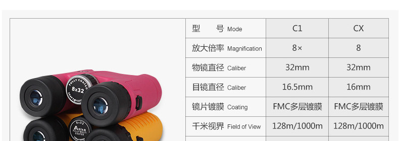 本店為天貓 公司經營,授權經銷商,商品型號與官方同步,C1和CX分屬兩個不同的型號,並無新老款之分,請認準【虯川運動戶外專營店】,謹防假冒 ~! C1和CX的配置區別:兩款的顏色 型號 款式 不同,除此之外,C1配的是尼龍包包【掛帶式】,CX配置的是軟包【穿扣式】;C1的彩盒采用的是經典喜慶紅,CX的彩盒采用的是簡潔白; 成像方面的區別:C1鍍藍膜,CX鍍綠膜;藍膜的透光率是95%,綠膜的透光率是98%;也就是說,綠膜的成像要稍微亮一點,其它無區別。【看演唱會 看賽事 旅遊 日常觀景,兩款的清晰度都足夠用了,不必為此擔心 ~!】