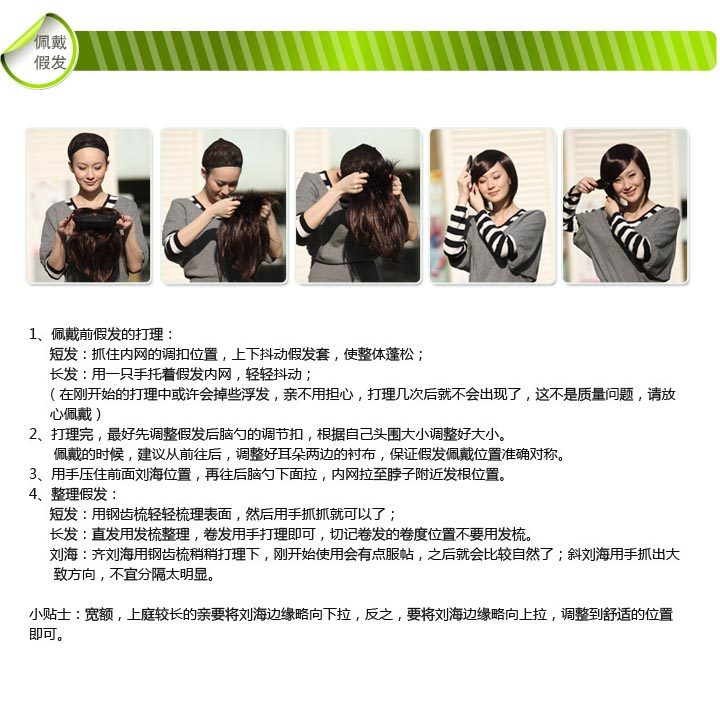 假發基本上為加長劉海的,這樣假發的擴展空間很大。如需要修的拍下時留言注明修的要求(平劉海、碎劉海、M劉海、碎齊劉海,或提供圖片修)就可以了,假發修後就不可以進行退換貨了,這個需要提前告知下!佩戴的效果因人而異的,頭圍大小臉型不同佩戴效果都是不同的,我們大概幫您修形狀出來,到時可以根據自己的佩戴情況稍微修和造型下喔!