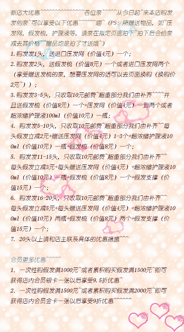 4﹒關於議價:各位請手下留情~~~~~~~假發已是白菜價~~~質量絕對 對得起~~~所以一般不議價~~~~如果多頭 購買~那麼~請大家圍觀相應的優惠細則~~XD~