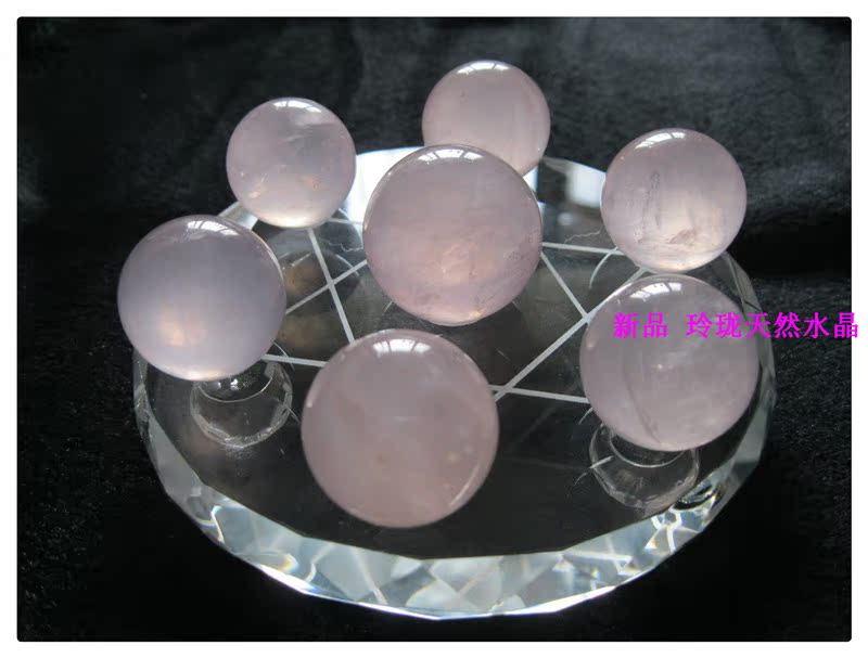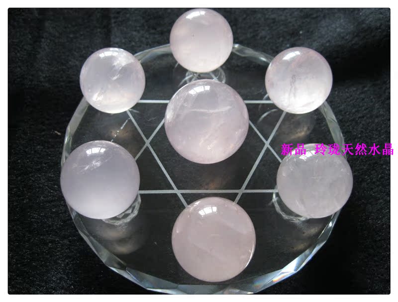 【規格】純天然粉晶+玻璃底盤,中間粉晶球約33毫米,邊上球約26毫米,底盤直徑約12毫米。實物要粉一點。