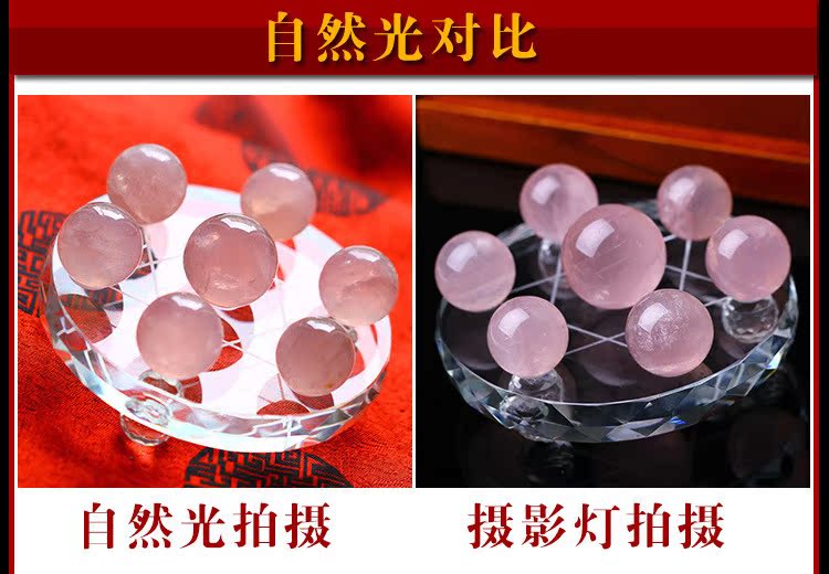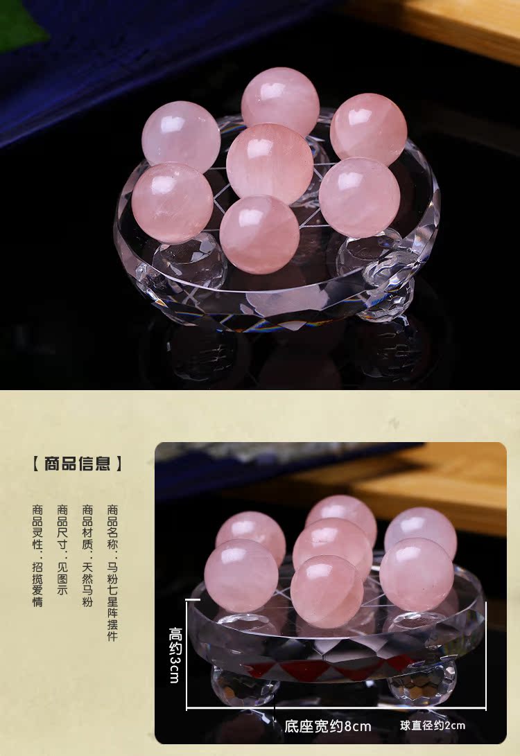 ,本店是一家真正自設工廠,批發中心的飾品企業。企業全稱廣州秦哲珠寶有限公司,旗下有百石緣,百石記,百石坊專賣品牌,在廣州,義烏,青島,鄭州均有批發營銷中心,本店堅持低價同時,更追求高品質的營銷宗旨,最大的讓利天貓賣家,賣家,其他平台賣家,實體店賣家,公司,飾品愛好者,批發零門檻,竭力與你一道開創飾品行業的經典名流!誠招加盟代理商,詳情請與客服咨詢! 材質:天然粉水晶七星陣 尺寸:底盤直徑8釐米 10釐米 底盤:k9水晶 提示:本店白水晶選材是400-500一公斤的5A級粉水晶,百分百純天然,既然是擺件我們就要選料用好的,擺出來纔有價值 市場是很多水晶選料用k9玻璃,或者100-200的普通水晶,一分錢一分貨,我們隻專注於高端,追求價比!