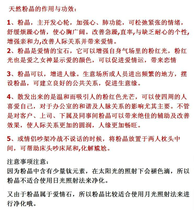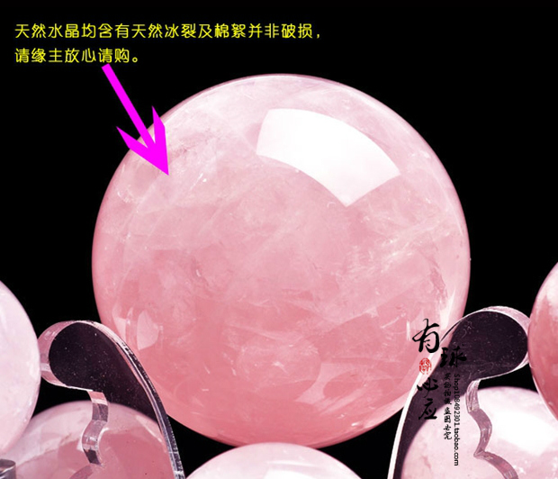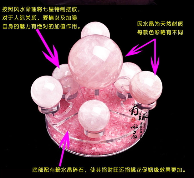 本店所有均在燈光下實物拍攝,未經過任何特效處理!力求將實物本來面目呈現在大家面前!但因顯示、光線等客觀因素,會造成實物與照片顏色有所偏差,這是無法避免的。請不要拿天然水晶去和人造飾品比較亮度和光澤,人造飾品都是越戴越無光澤,而天然水晶是越戴越亮,俗稱“石無瑕,天無雲”再完美的東西也會有細微。要求完美無暇的建議去選擇人造飾品! 天然水晶及各種半寶石一般都不如人造水晶或者玻璃通透 ,大部分天然水晶晶體都具有水晶的天然棉絮、冰裂、礦缺,和打磨過程中人為造成的硬傷,還有的手鏈單珠會有大小懸殊,這就是我們所說的遺憾美。和人一樣,喜歡她就要接受她的缺點,人無完人,更何況出自億萬年前的水晶呢!請大家了解天然水晶、愛護天然水晶,希望每一個屬於您的水晶都能給您帶來好運。 開光天然粉水晶球七星陣擺件/招桃花旺姻緣促進夫妻感情/有球必應 ' |