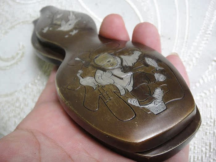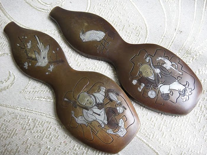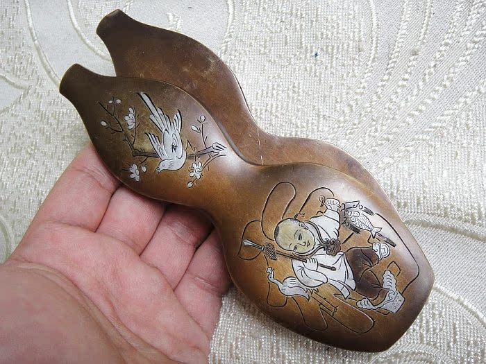 古典收藏黃銅質老鎮尺 實心古銅葫蘆平安鎮紙 福壽對件擺件