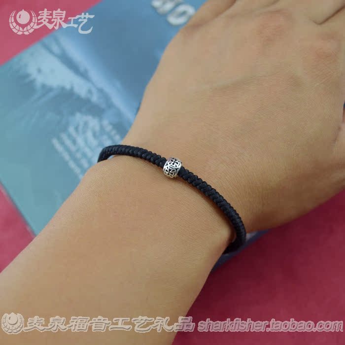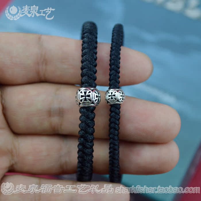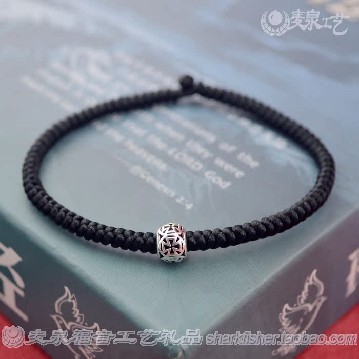 【名稱】麥泉手工編織黑繩手鏈925純銀鏤空十字架 男女情侶基督教飾品禮品