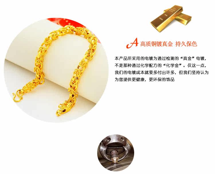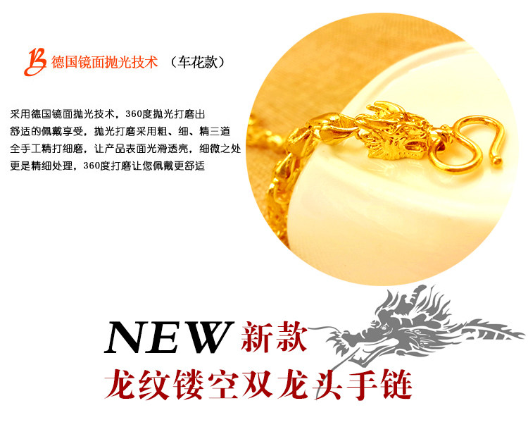 手鏈粗5毫米,長18.5-21.5釐米,重約20克 尊貴專享 18K金 男士專屬龍頭扣手鏈 龍在中國傳統文化中是權勢、高貴、尊榮的像征,又是幸運與成功的志。 ![]() 權勢/高貴/尊榮 龍在中國傳統文化中是權勢、高貴、尊榮的像征,又是幸運和成功的志。龍的現像是 經過不斷發展變化的,在漫長的歷史過程中經過戰爭和聯合,信奉龍圖騰的民族逐漸成 為領導。 幸運/成功/智慧 龍的各部位都有特定的寓意:突起的前額表示聰明智慧;鹿角表示社稷和長壽;牛耳寓 意名列魁首;虎眼表現威嚴;魔爪表現勇猛;劍眉像征英武;獅鼻像征寶貴;金魚尾像 征靈活;馬齒像征勤勞和善良。 ![]() ' ." |