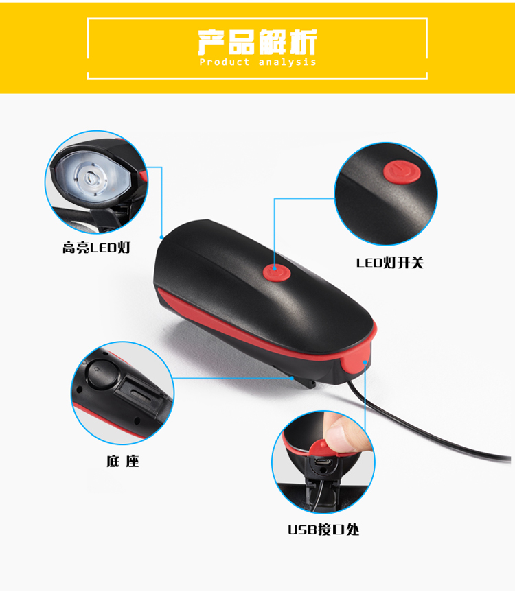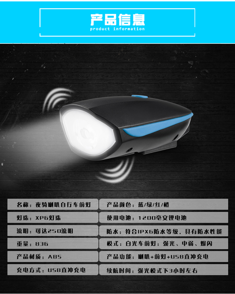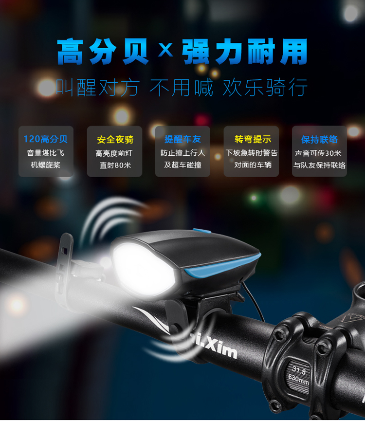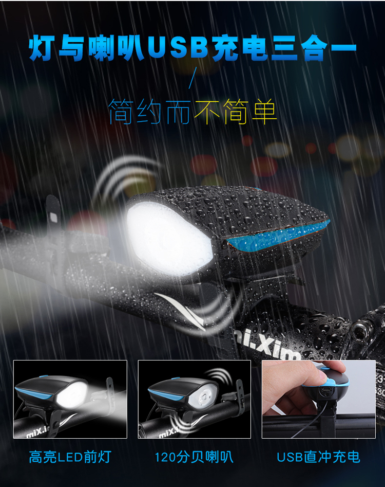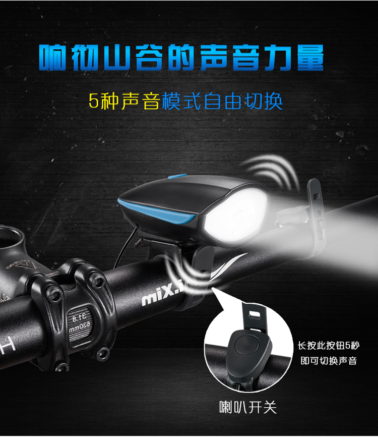 Kelly進口XPG光源自行車燈車前燈充電強光手電筒帶喇叭USB山地車配件夜騎行電鈴鐺