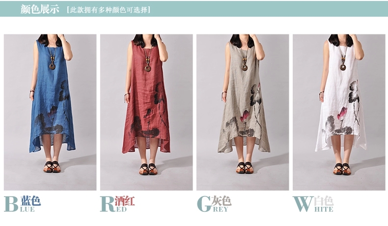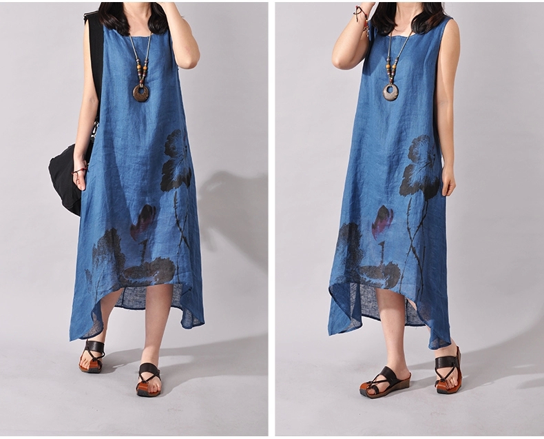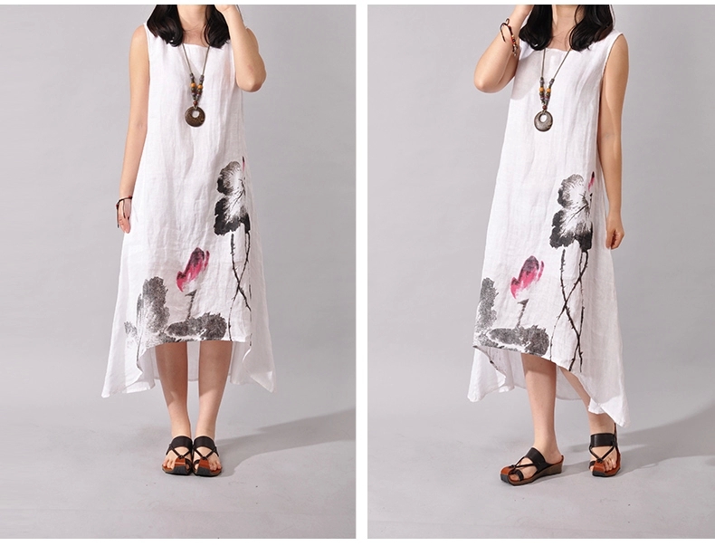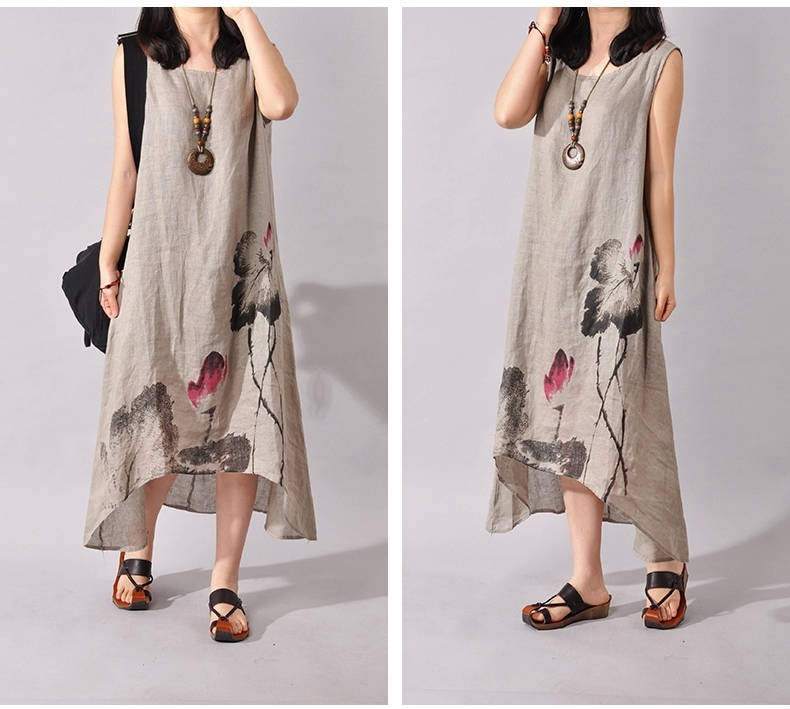 MY 質感加倍 !亞麻復古中國風水墨印花寬鬆大碼大擺中長款棉麻連衣裙