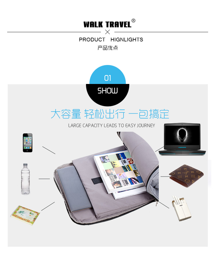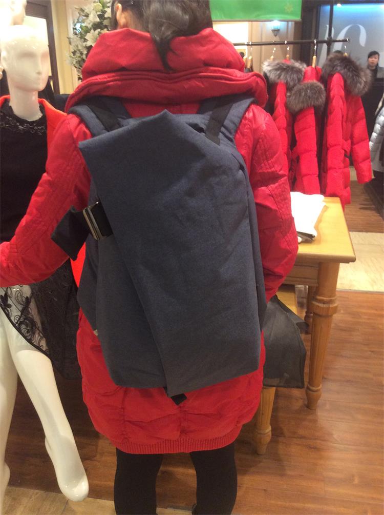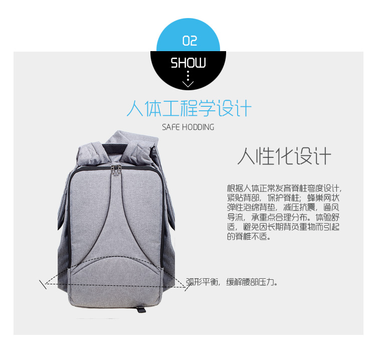 此款包包原型是一种背上行囊,设计者以创新的理念,被设计为使用一台笔记本电脑的创造者,为在城市里移动的专业人士,提供实用又有型的创新功能包包;为个性十足的商务人士及学生重新定?了一个新的平衡形式与功能的生活方式,在人海中吸引品味人士的注意。 独特造型的背包,前后双层置物空间,可收纳笔记本电脑及大量书本;多个口袋,方便收纳小型物品;特制通风?震背垫、圆润的背带设计,优美的弧形线条及百搭的颜色,是一个时尚完美的人体工程学背包。