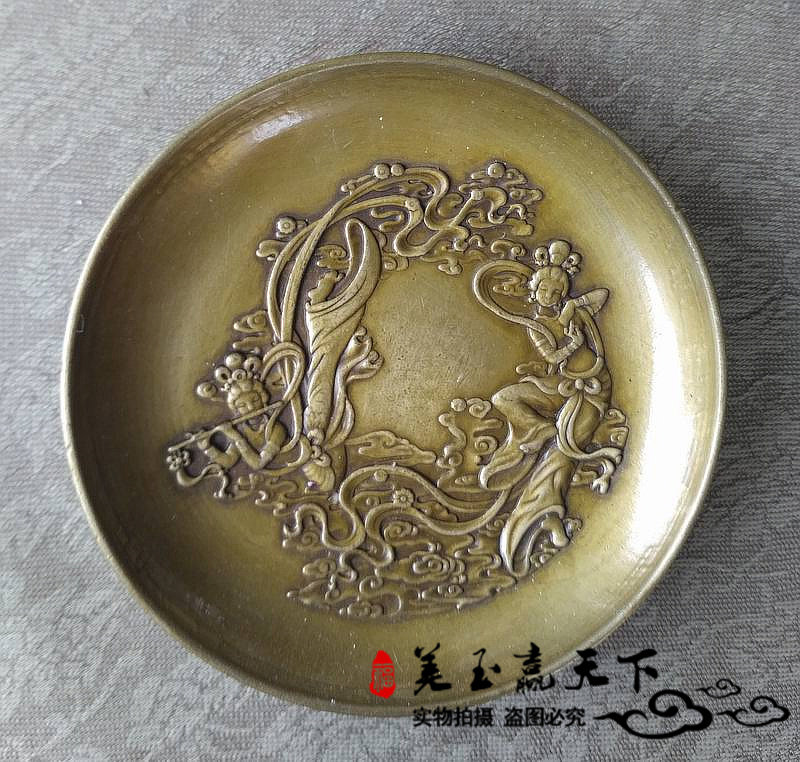 黃銅盤子黃銅美女碟子仙女演藝圖碟子文房四寶小筆洗雜項
