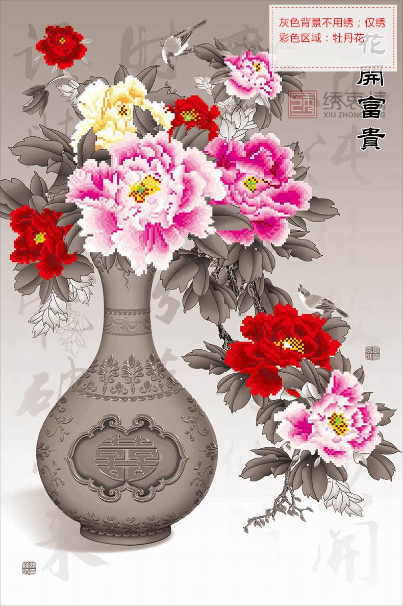 新款印花3D十字繡客廳系列油畫富貴平安牡丹爭艷如意花瓶富貴吉祥