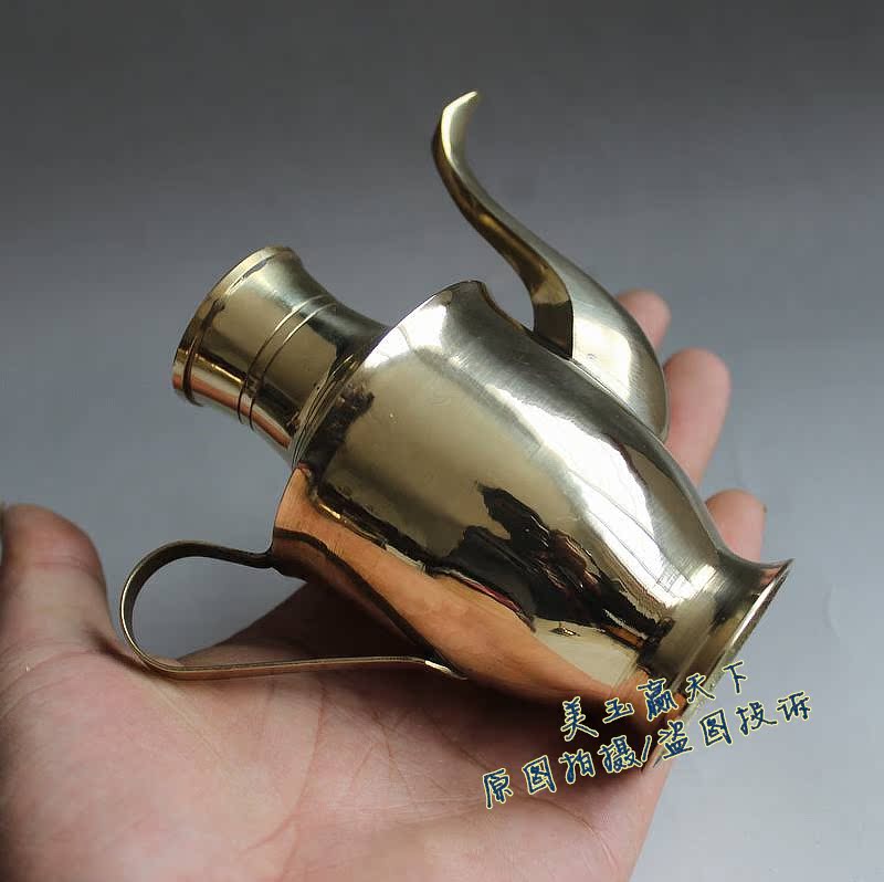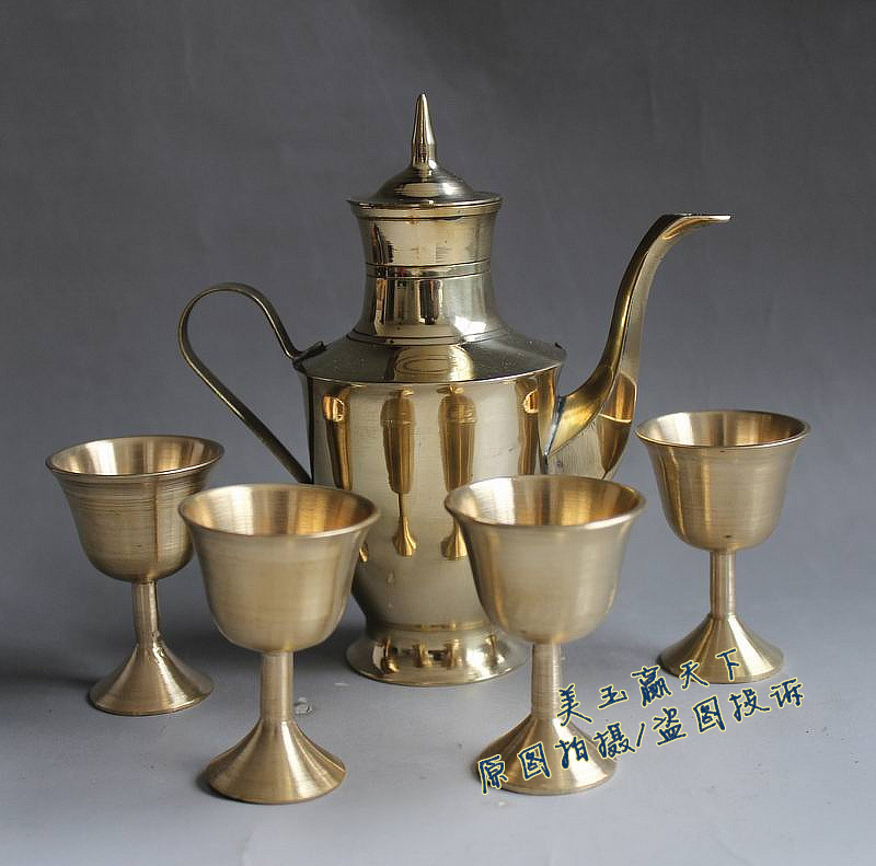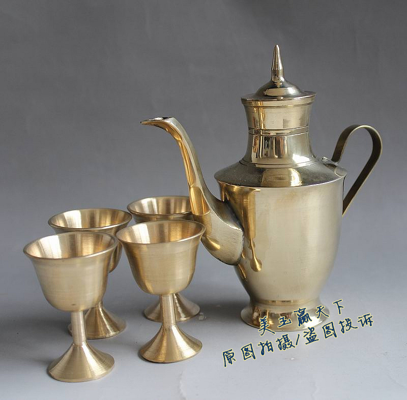 品名:黃銅酒具一套 規格:壺:13*6.5*14.5厘米 杯子:5.6*4厘米 工藝:普通仿古工藝 年代:現代品