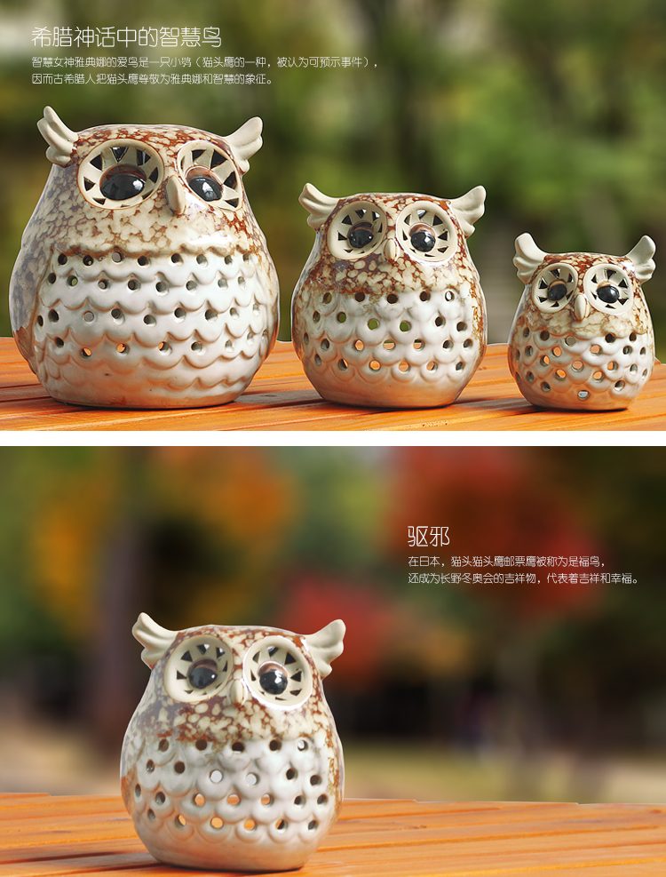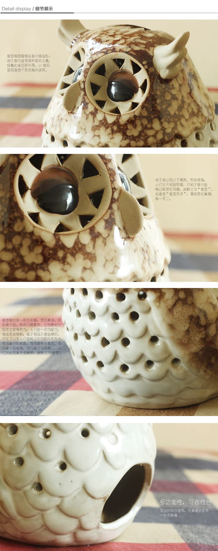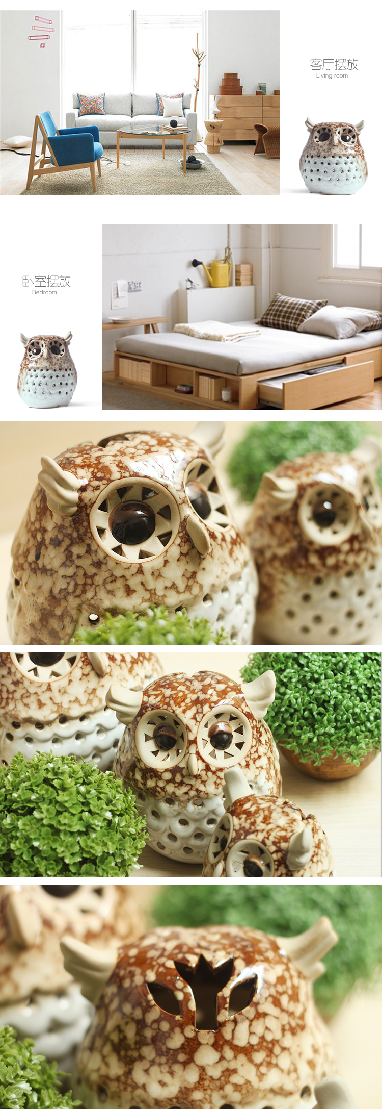 讓生活彌漫田園的氣息,讓生活的每個角落都充滿綠色健康,寧靜的夜晚,貓頭鷹家族為您點亮的,是守候,是凝望.燭臺的設計使其更具有實用性,身后開口使其取放蠟燭更容易,前方肚子開孔方便光線照出,陶瓷釉變工藝使貓頭鷹更加栩栩如生。