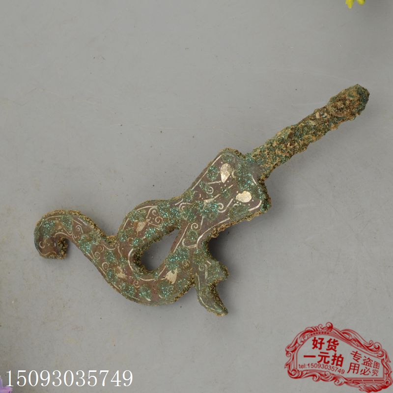 古玩雜項收藏戰國漢代青銅器小擺件精品做舊帶扣實心描銀青銅帶鉤