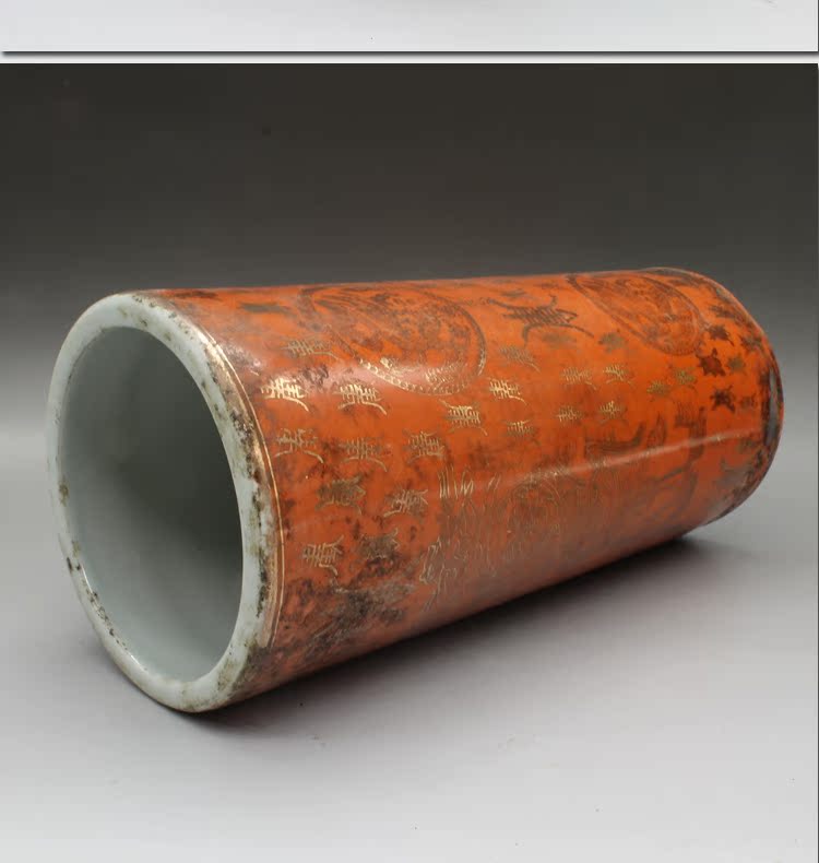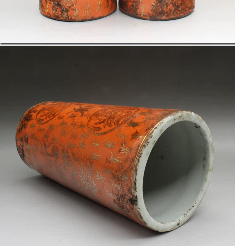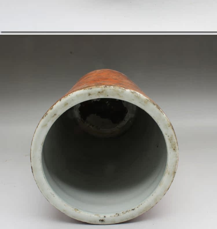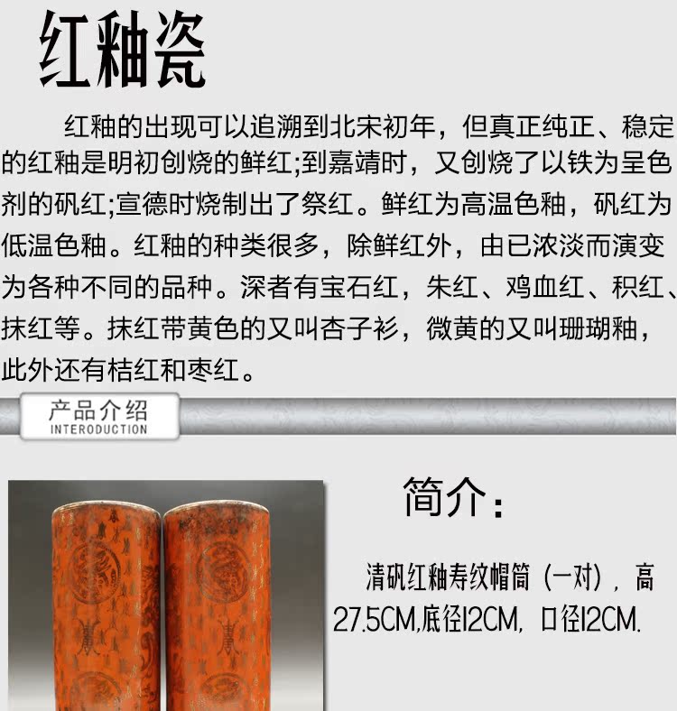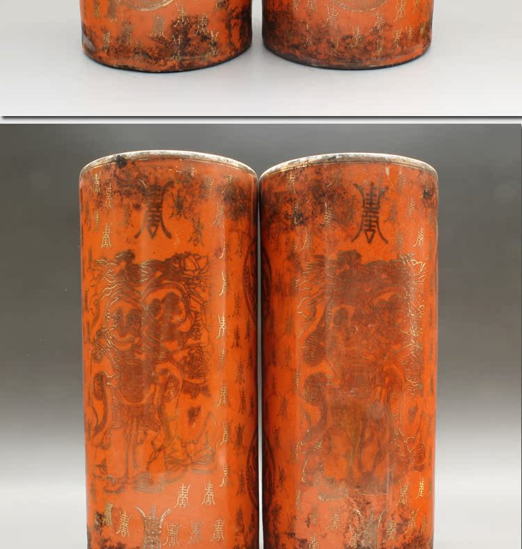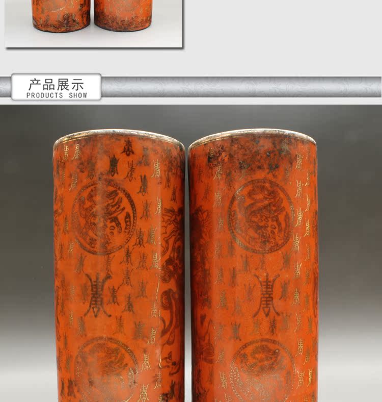 清同治礬紅壽紋帽筒(一對)古玩瓷器老貨古董老陶瓷仿古擺件收藏1入