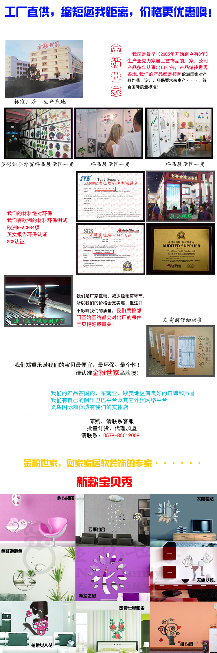 本公司大部分商品6一10天到貨。不接急單。急單的客戶請不要下單。感謝諒解與合作!![]() 很滿意的,買了好幾款,貼上都很漂亮。 大方上檔次。鏡面很亮,下次還會再來的,推薦了 ![]() 鏡面很亮,一開始還以為是次品,原來上面都有層膜保護的,咨詢了下客服才知道哈哈,總是很不錯,亮亮的 ![]() 很漂亮的一款電視背景墻,而且大氣、時尚,給客廳增加了一份美感,粘接力強,店家服務態度很好滿意的 ![]() 很漂亮,粘性好強,貼錯了不好重貼,但是真的特別好看!!!因為當時特別急著用,所以很快就發貨,很快就到了!特別棒!! ![]() 很漂亮呀,貼在寶貝的房間里很生動,一群群小魚游到了房間里,非常不錯,用來裝飾墻面本身挺單調的 ![]() ![]() 【產品說明】:不屬于玻璃,塑料的一種,款式潮流新穎,材質可輕微彎曲,重量輕,不易碎,不需要破壞墻面,可貼在墻面、墻紙、瓷磚、玻璃、衣柜等地方,開燈后反光效果極佳,是家裝擴大空間,提升亮度的最佳材料。鏡面效果可與鏡子媲美。正常使用中,銀色鏡面近處和水銀鏡子一樣遠一些會有影像變形,裝飾性強,不完全能代替鏡子!要求不高需要用來當鏡子的親銀色是最佳選擇過分追求完美主義者慎拍! 【粘貼技巧】:貼好后,揭正面的保護膜時,可用針類挑起一個小角,就可以很容易撕開了。此鏡是裝飾鏡,鏡面揭掉保護膜后請務必不要隨意刮擦,鏡面需要您的細心呵護! 【注意】:此款尺寸較大打包不了,所以需切割成若干份,親買回去拼起來就可以,連接部分會有一條直線,介意勿拍。