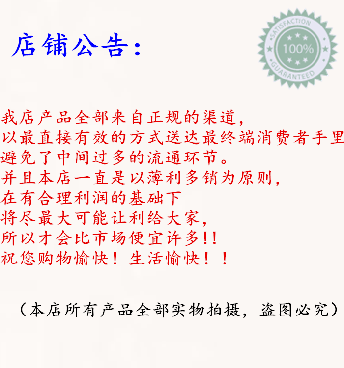 溫馨提示:親們本店產品沒有質量問題是不支持退換貨的,郵包本大利薄,請親們理解。祝您購物愉快 |