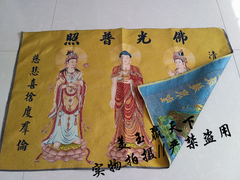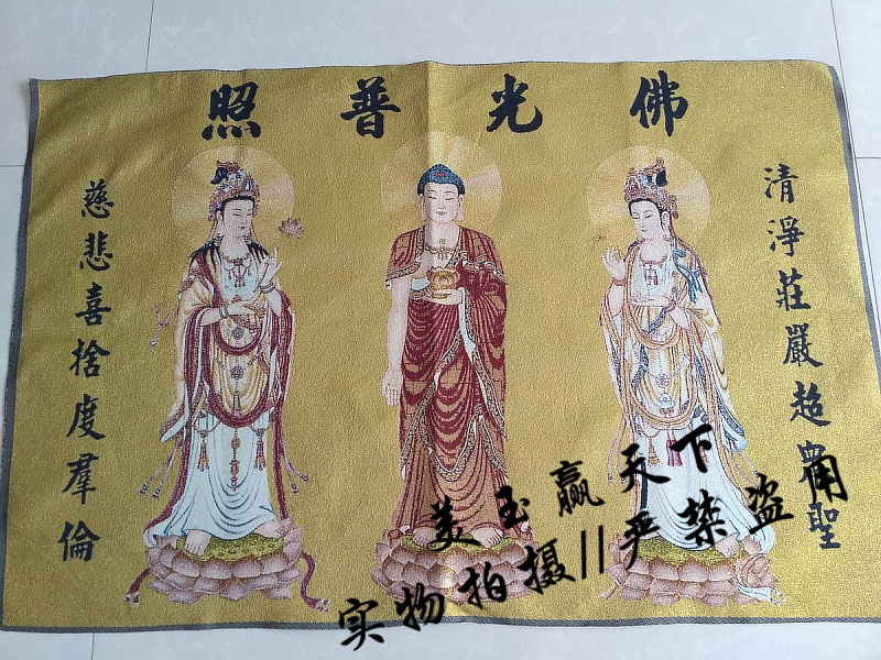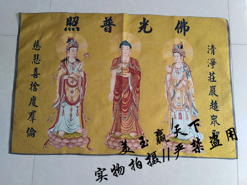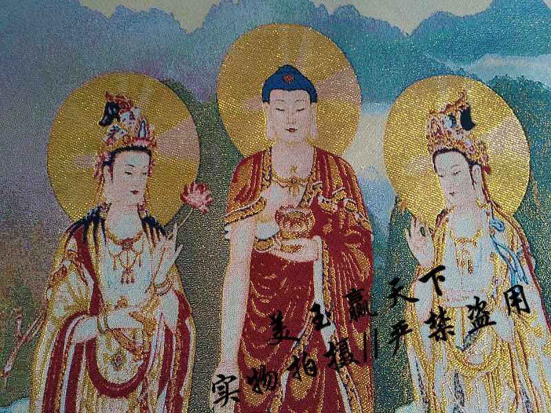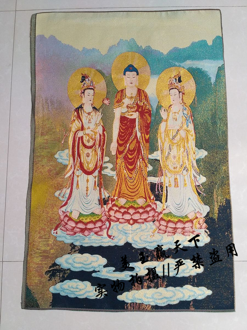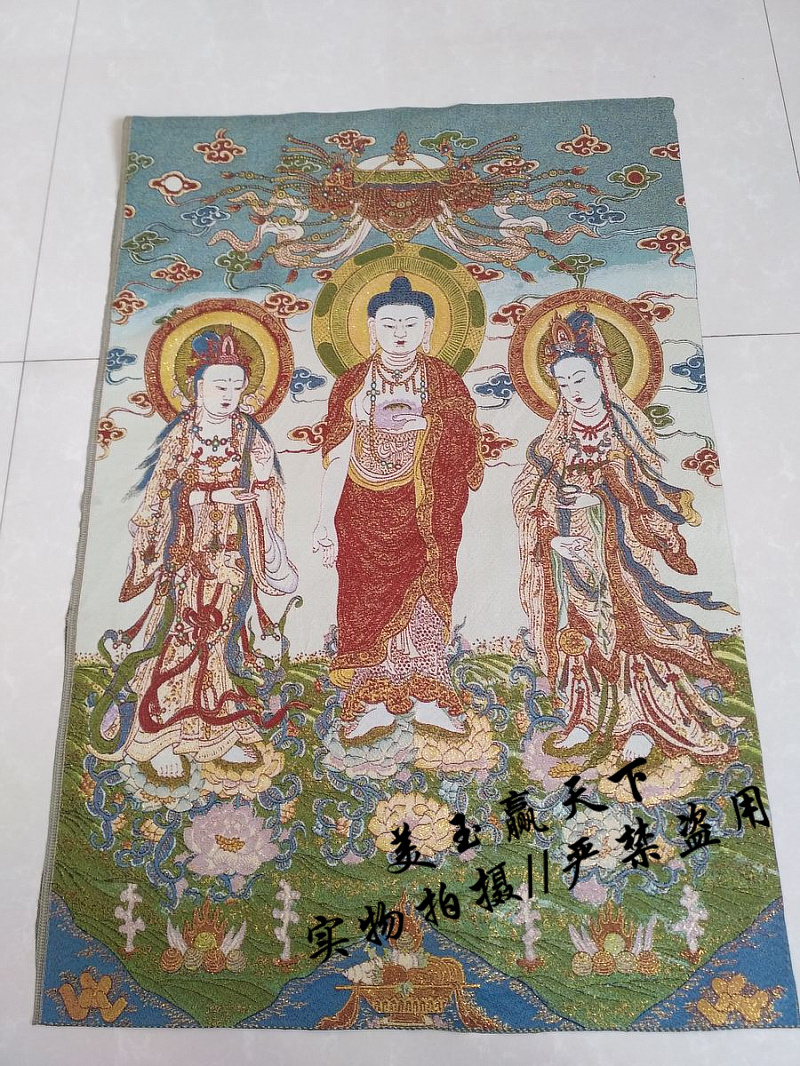 西方三圣是西方極樂世界阿彌陀佛、觀世音菩薩和大勢至菩薩三尊主要的佛菩薩。在佛教造像上,三者皆在蓮花座上,蓮花象征出淤泥而不染,于一真法界而能應化在十法界;阿彌陀佛居中,觀音菩薩脅侍在左,大勢至菩薩脅侍在右,三者為修行凈土宗者禮敬的對象。阿彌陀佛是表無量光明,無量的壽命,無量的功德;觀音菩薩是表大慈悲,宇宙的大慈悲;大勢至菩薩是代表喜舍。 說明:工藝:織錦布畫 規格:90*60厘米左右