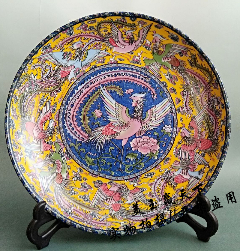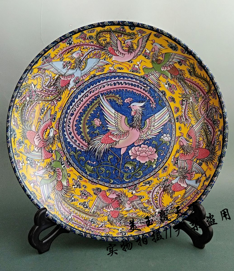 仿古瓷器景德鎮青花瓷器彩色百鳥朝鳳擺件買盤子送架子