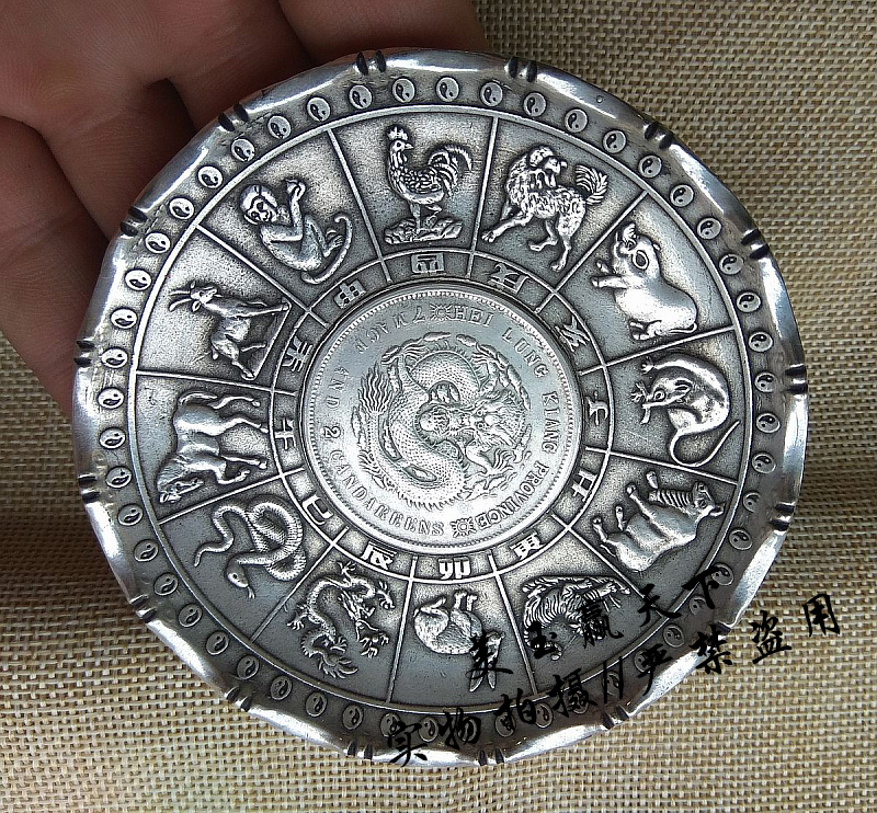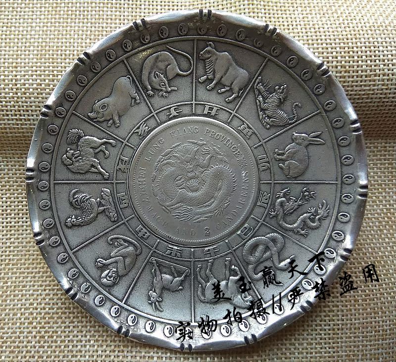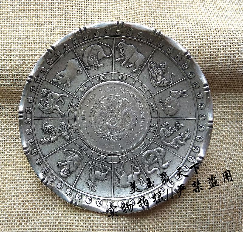 雜項白銅鍍銀碟子十二生肖龍銀元盤子博古擺件筆架