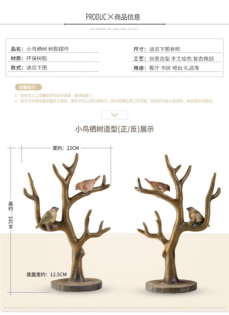 小鳥棲樹首飾架,造型大氣美觀,做工精致,仿實木工藝,飽滿有力的枝干,婉轉柔美;兩只小鳥兒深情相望,恩愛纏綿。鳥雀表情刻畫細膩,神態飽滿;樹枝的紋理,與底座的年輪造型都非常逼真,引人遐想無限...