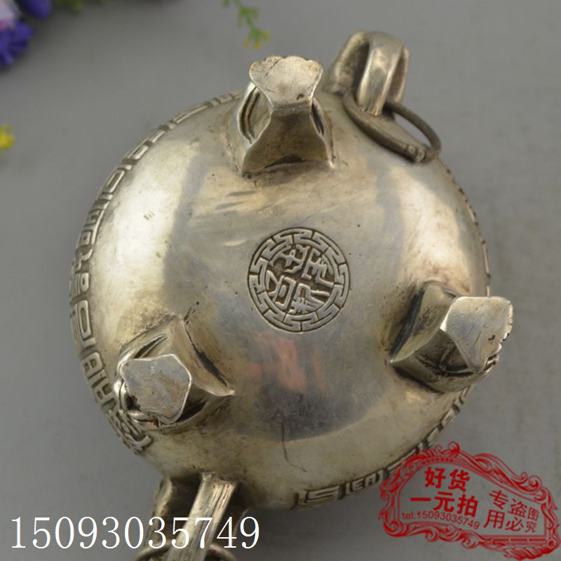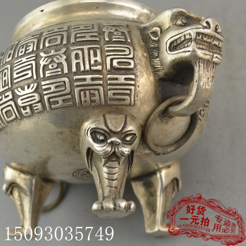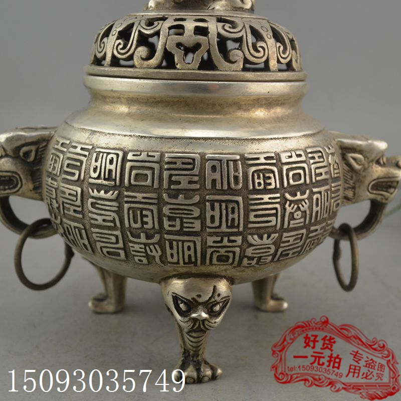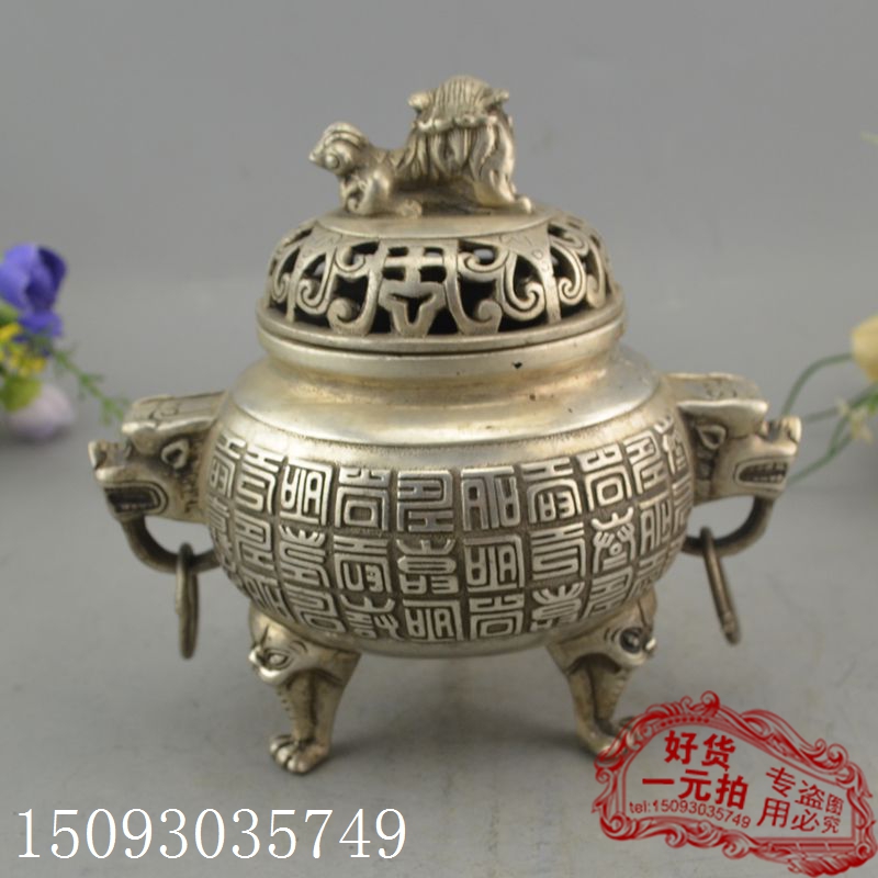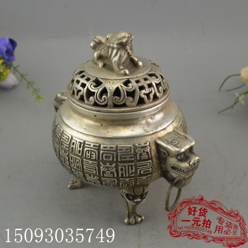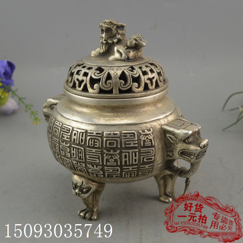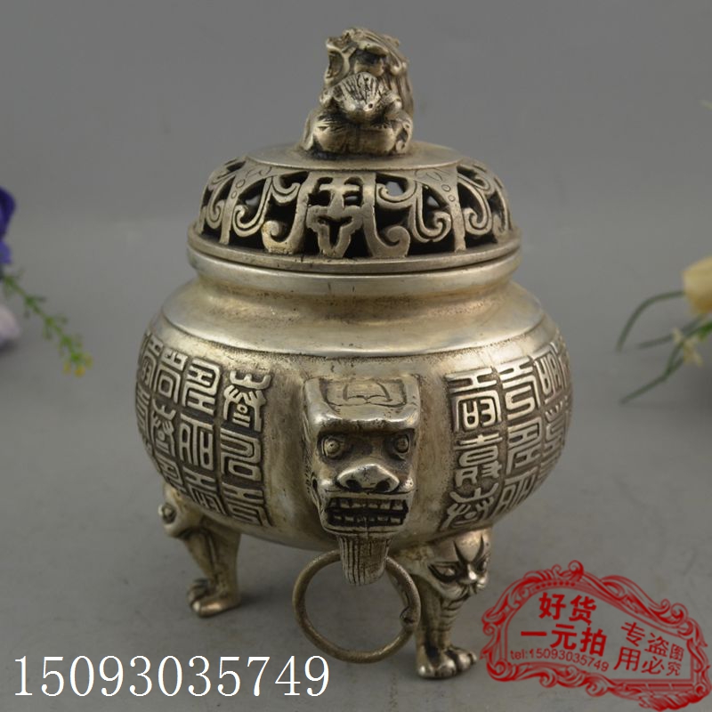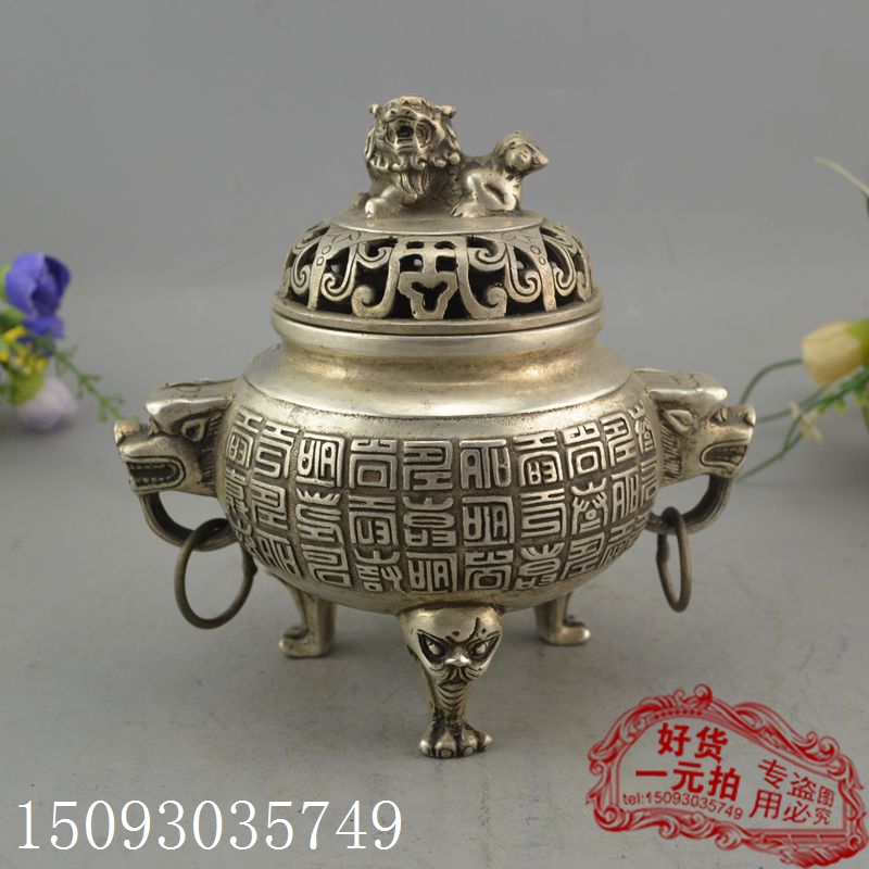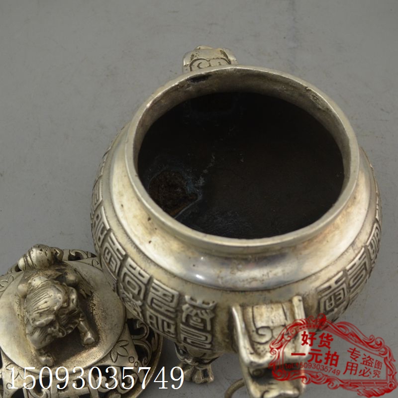 古玩銅器收藏黃銅擺件 白銅鍍銀銅器商務禮品 獅子香爐