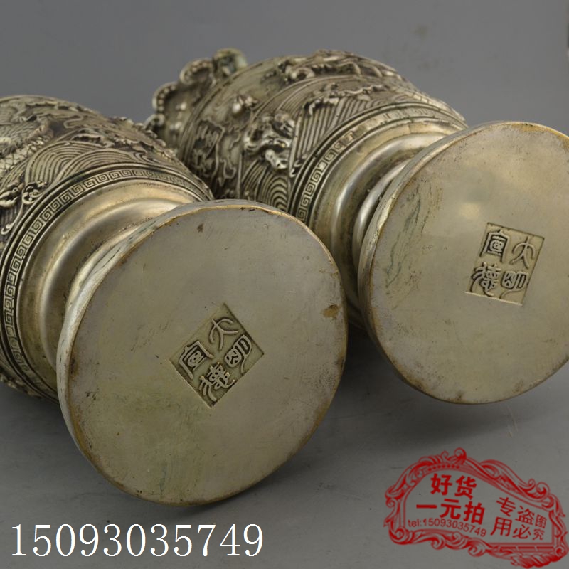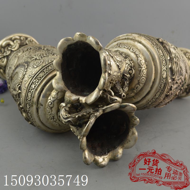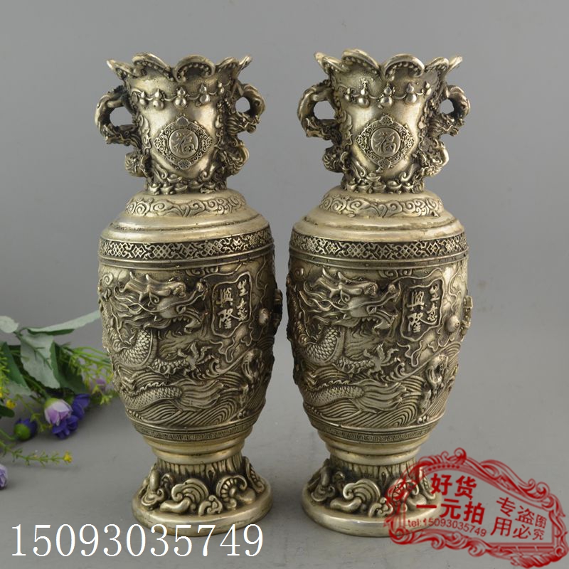 古玩銅器收藏黃銅擺件 白銅鍍銀銅器商務禮品 雙龍花瓶