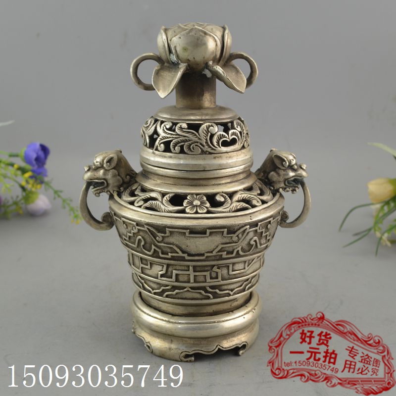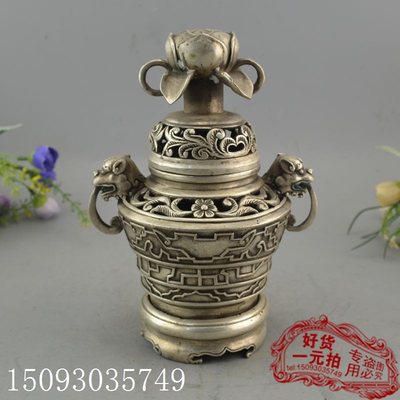 古玩銅器收藏黃銅擺件 白銅鍍銀銅器商務禮品 雙獅香爐