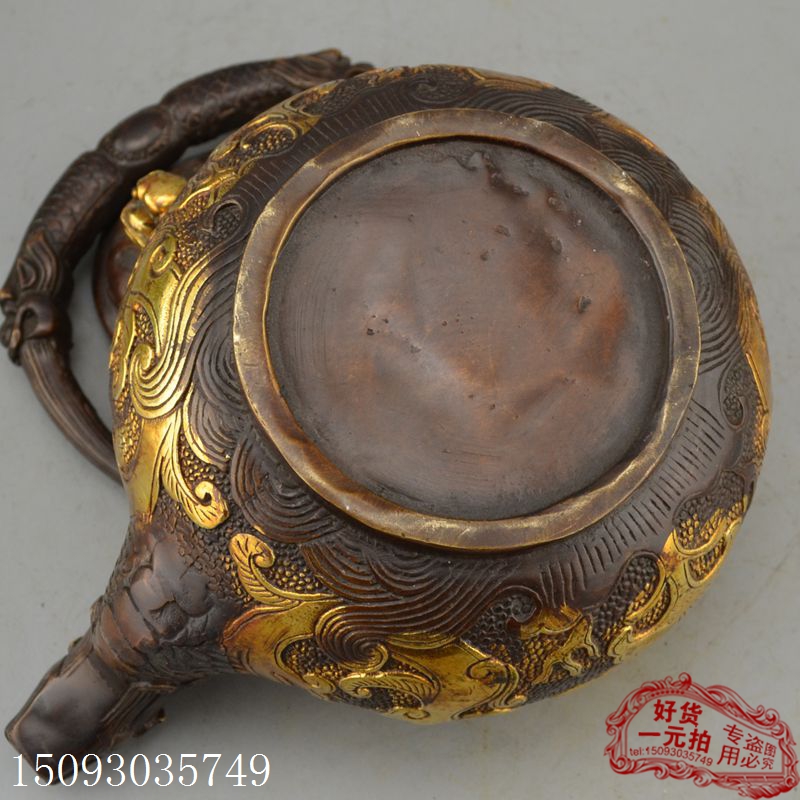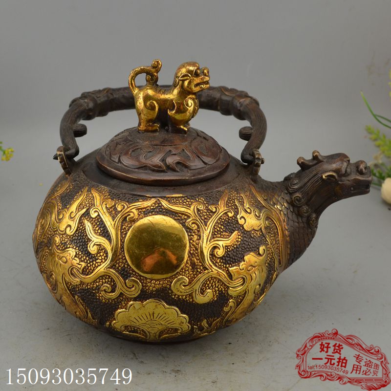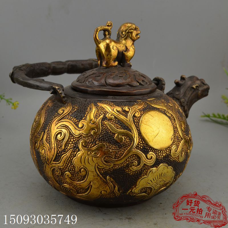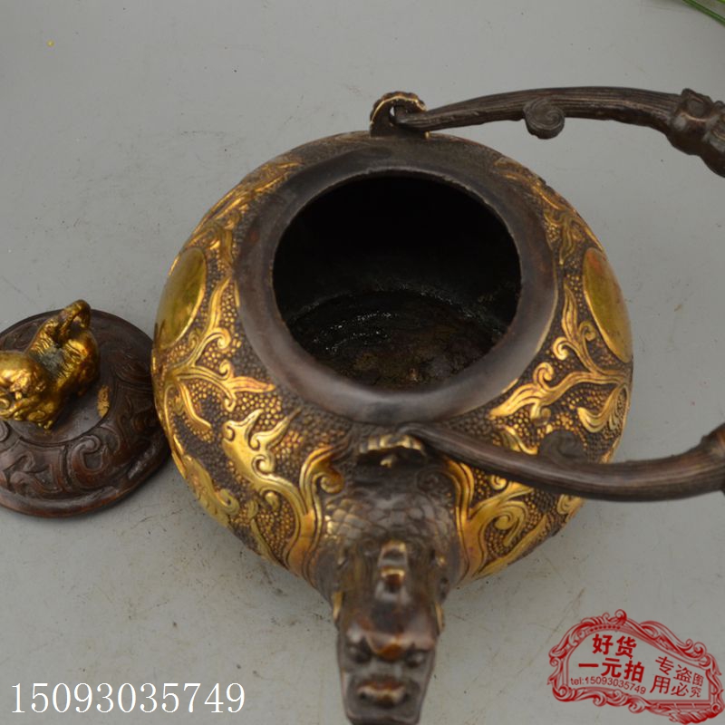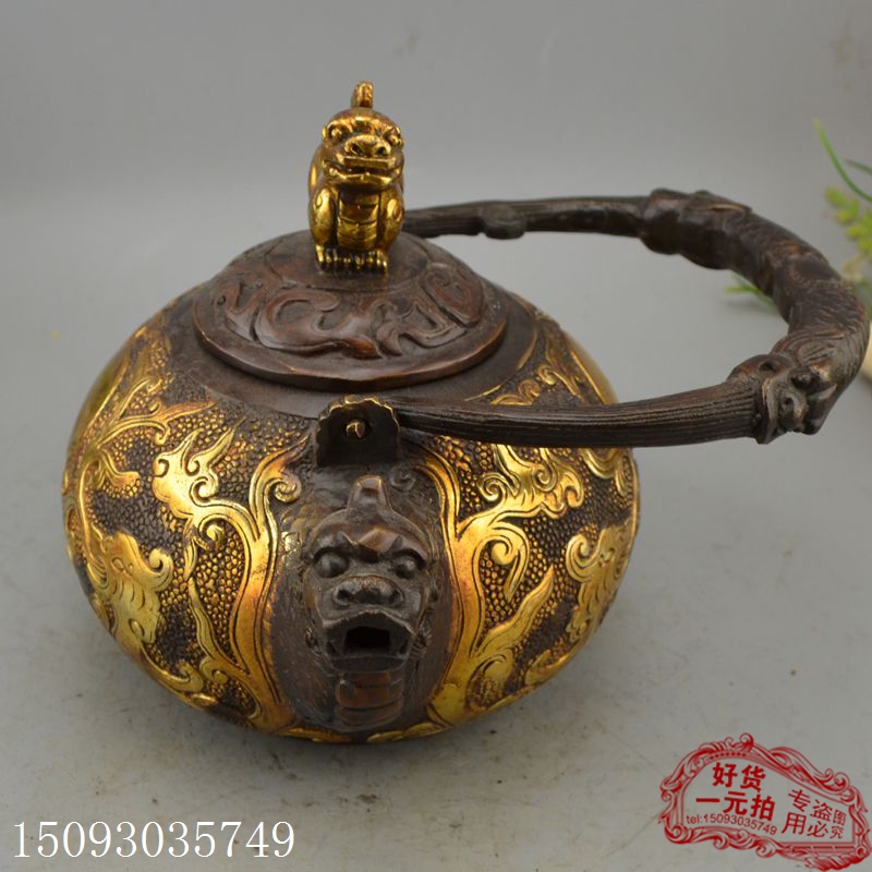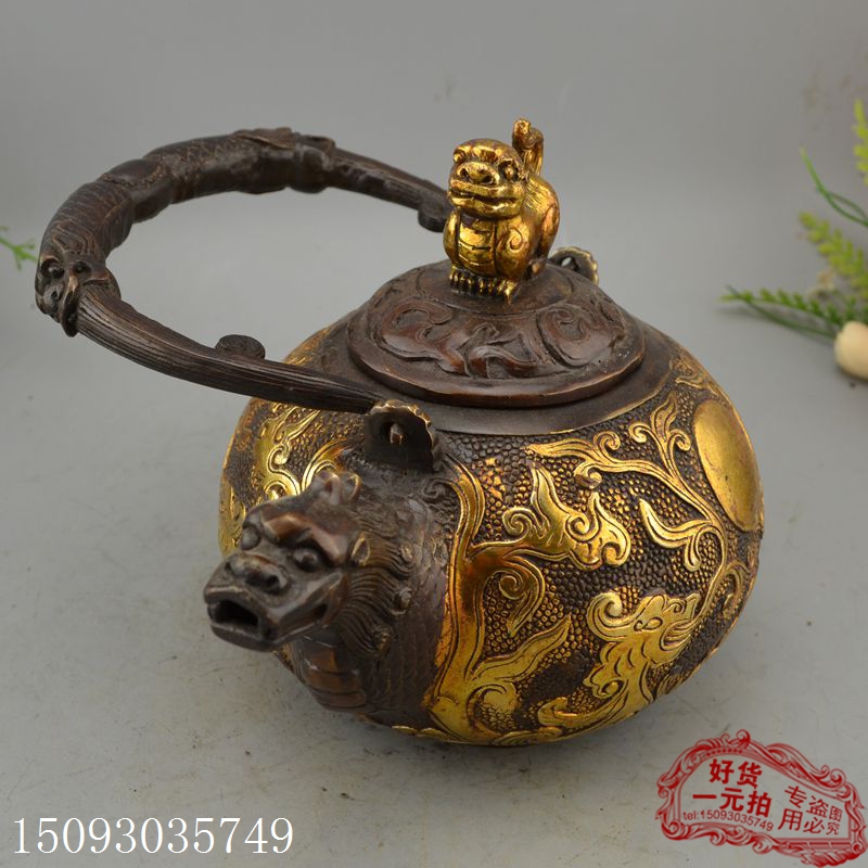 銅器收藏黃銅擺件商務禮品古銅色鎏金銅水壺雙龍獅子壺 手提壺