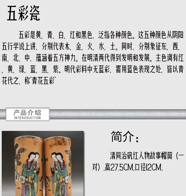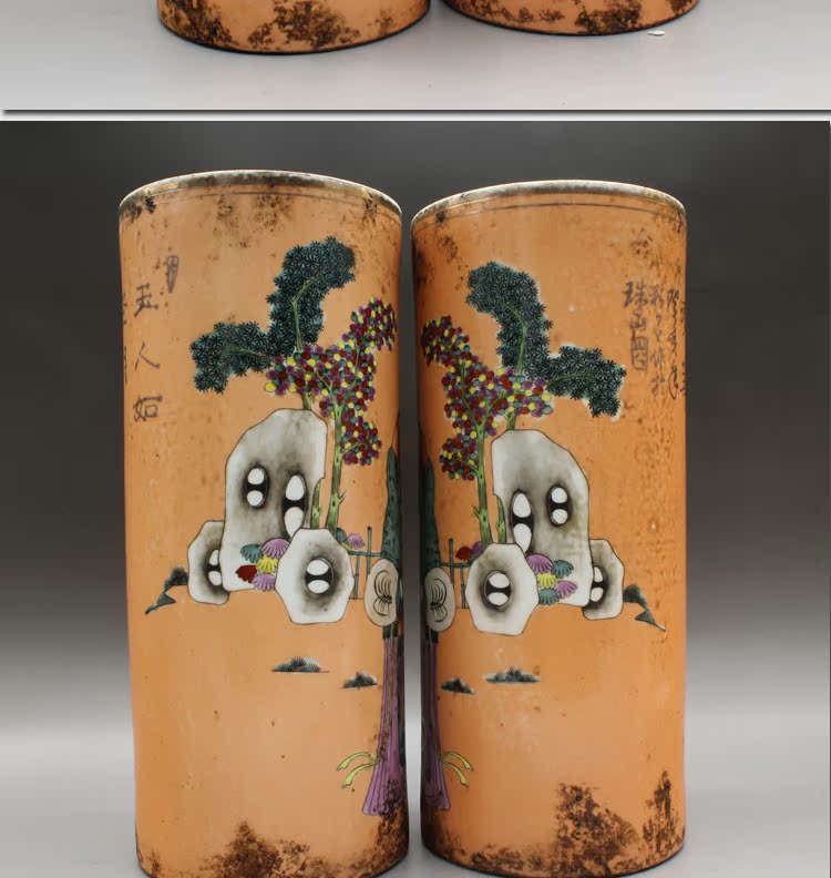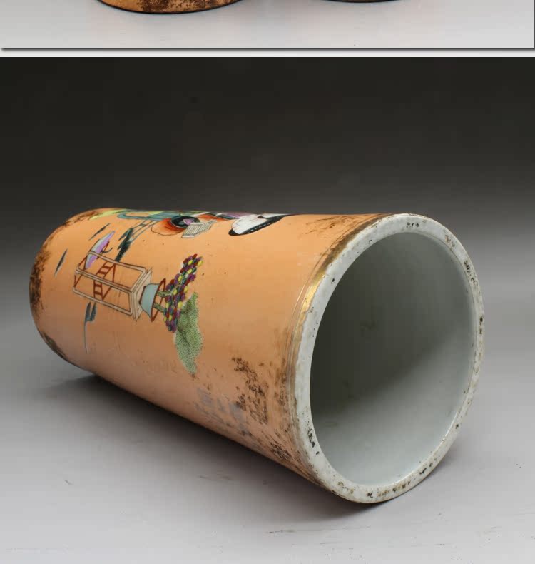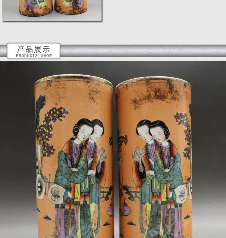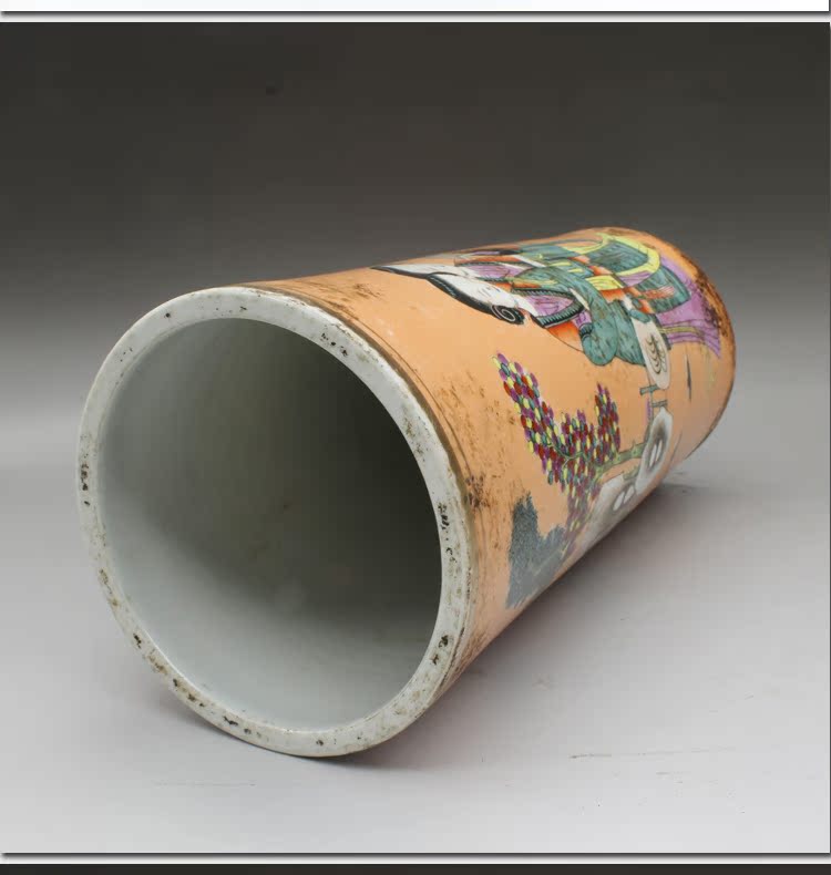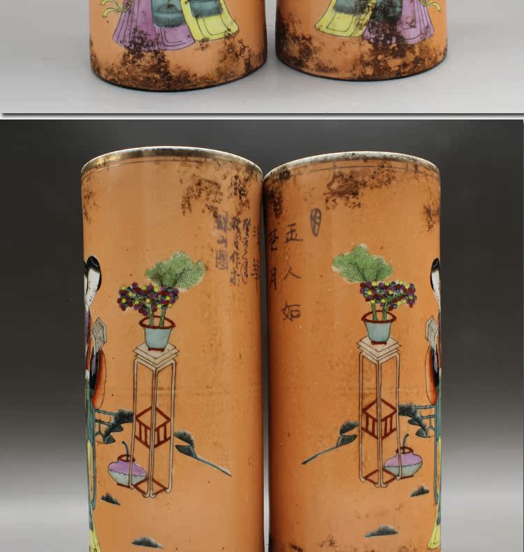 清同治礬紅人物帽筒(一對)古玩瓷器老貨古董老陶瓷仿古擺件收藏1入