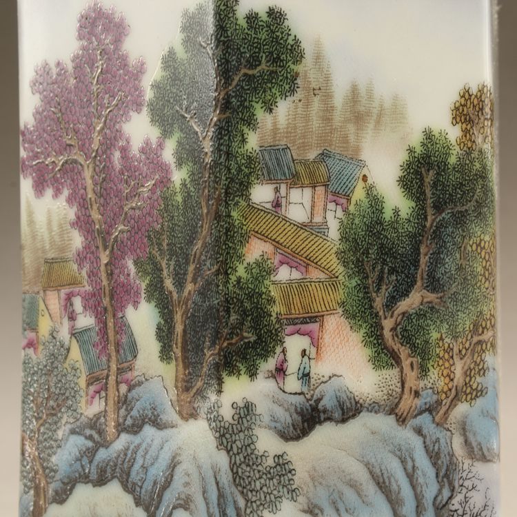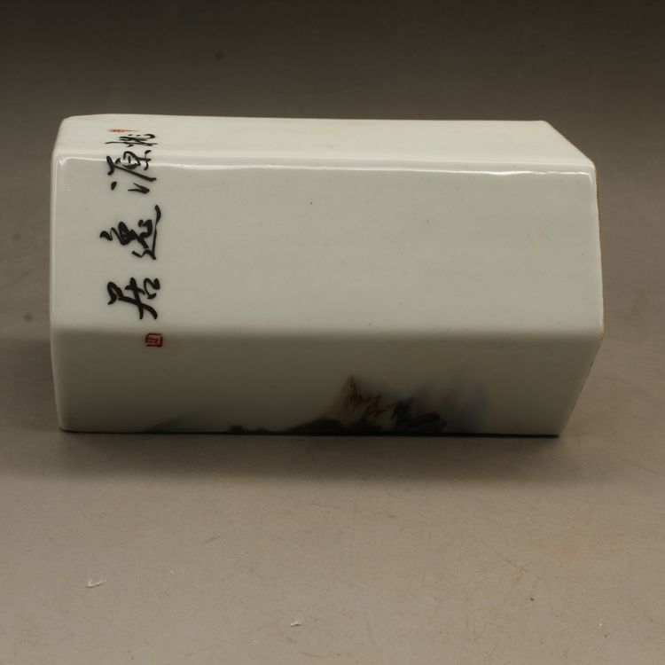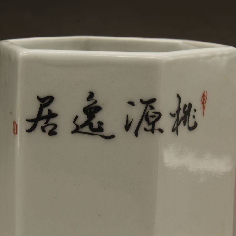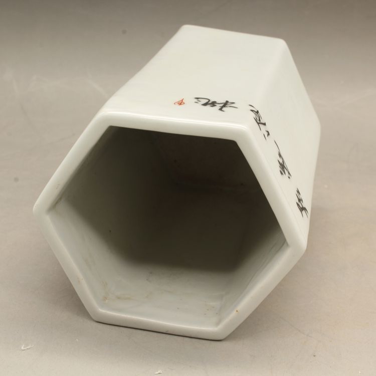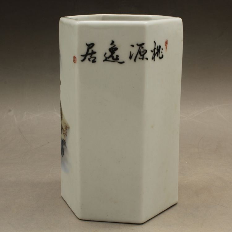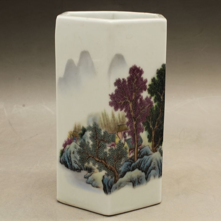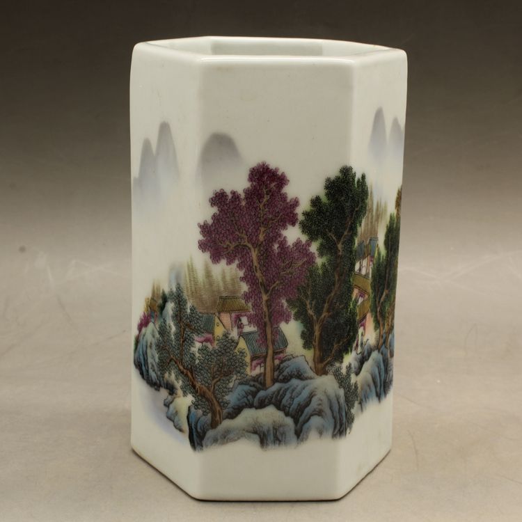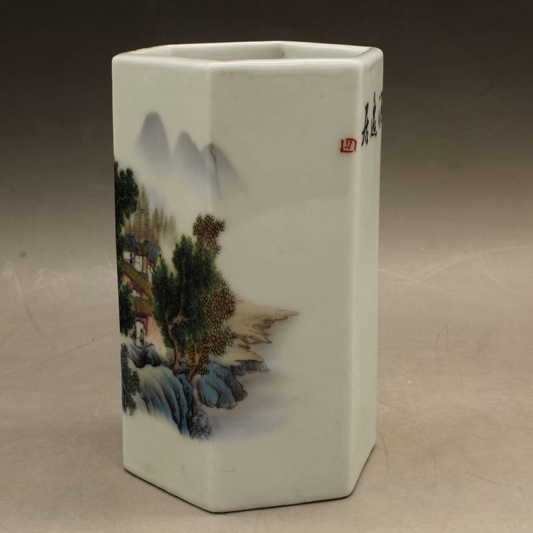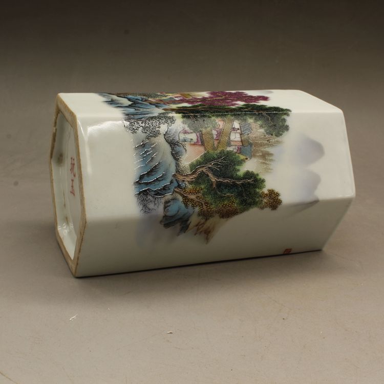 促銷玩玉款粉彩山水六方筆筒古玩古董老陶瓷仿古做舊擺件收藏1入