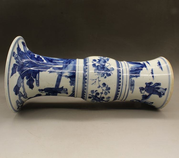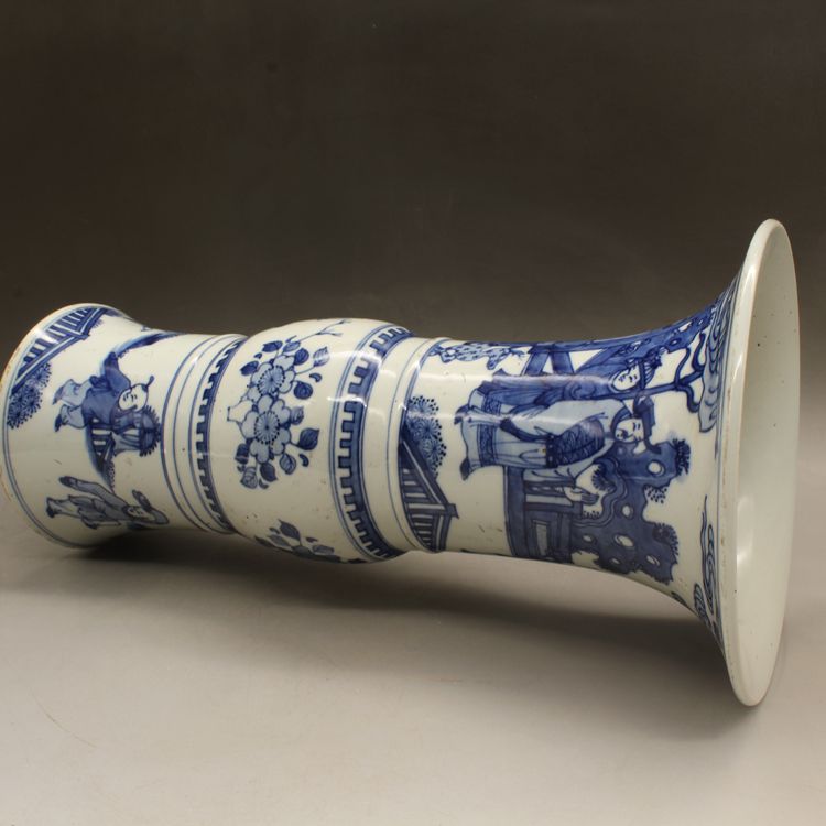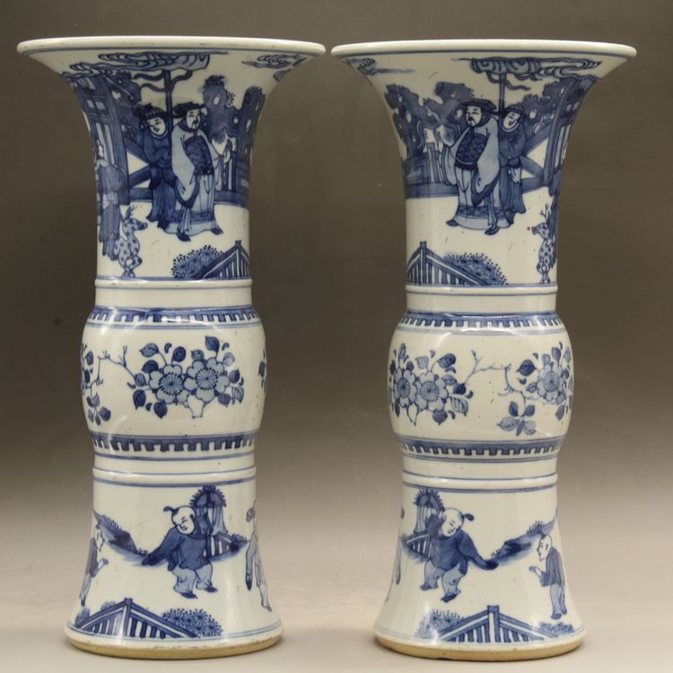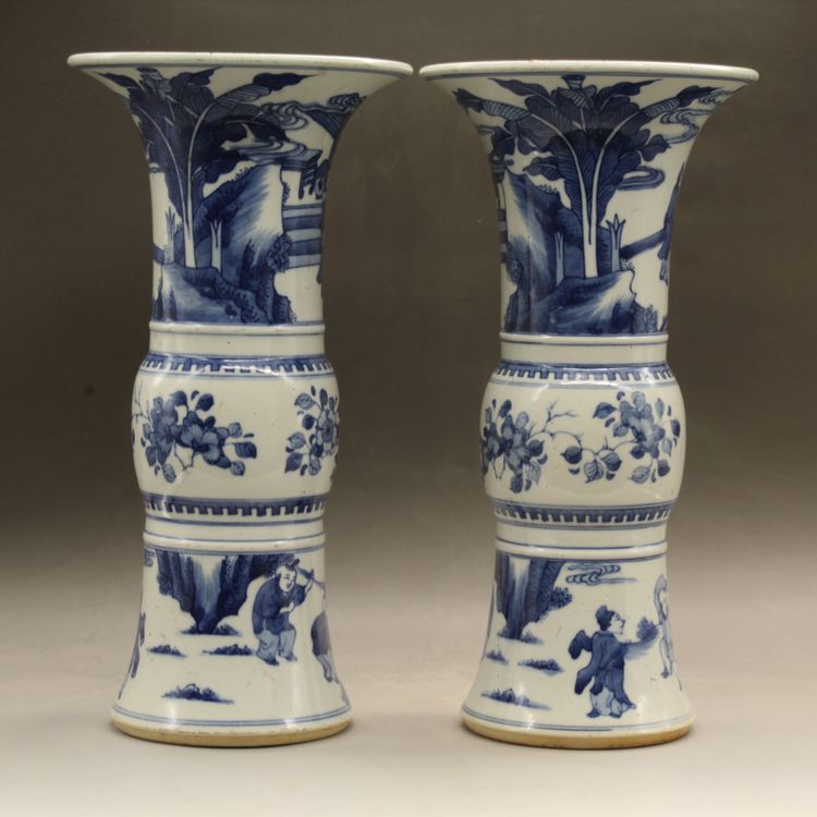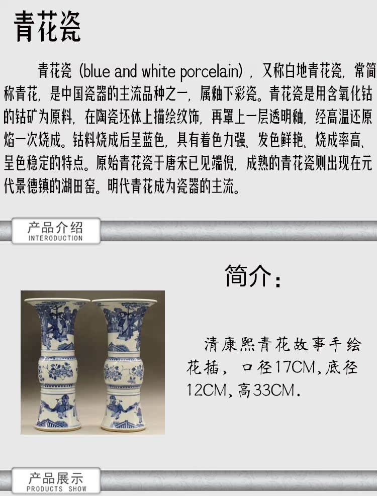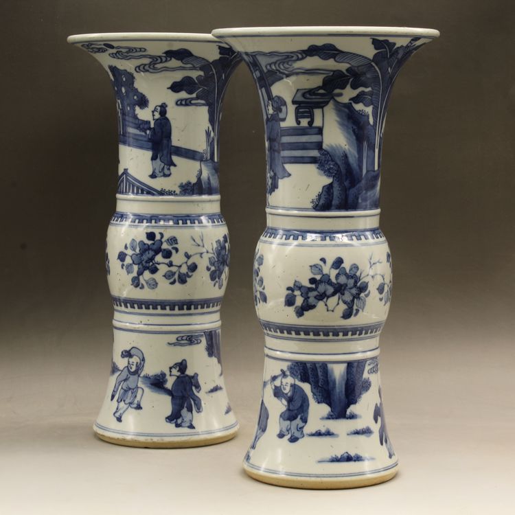 清康熙青花故事花插(一對)古玩瓷器老貨古董老陶瓷舊貨擺件收藏1入