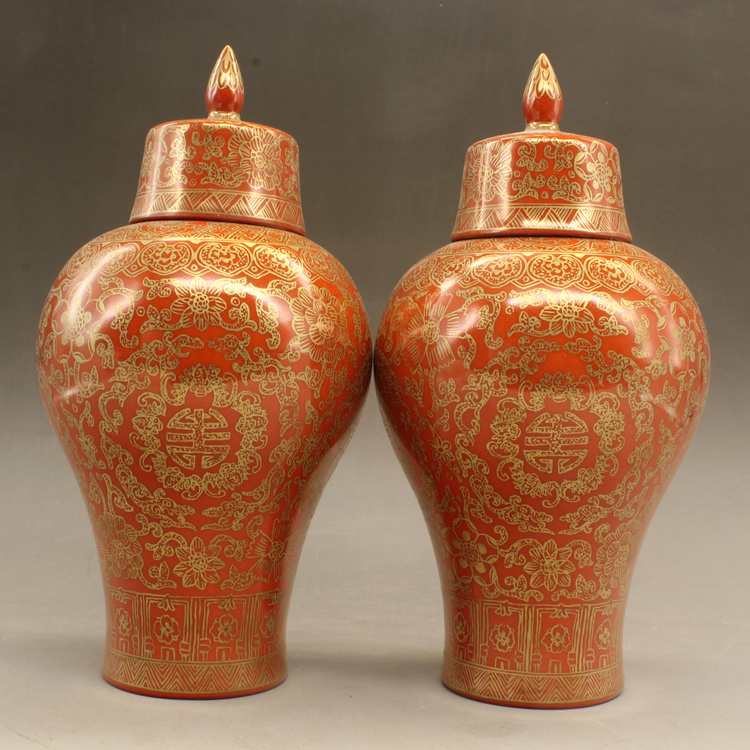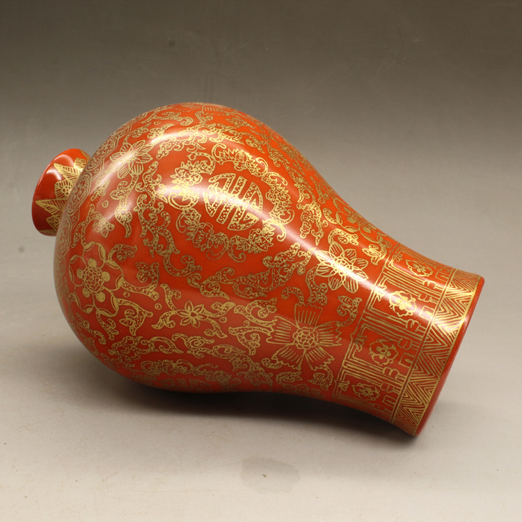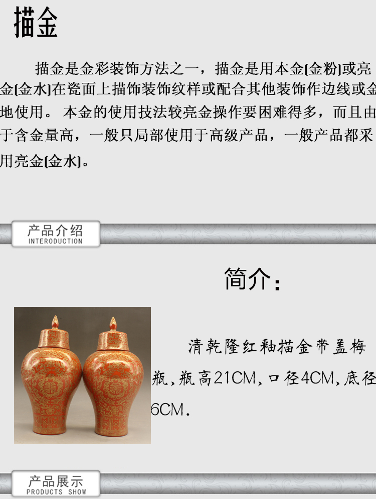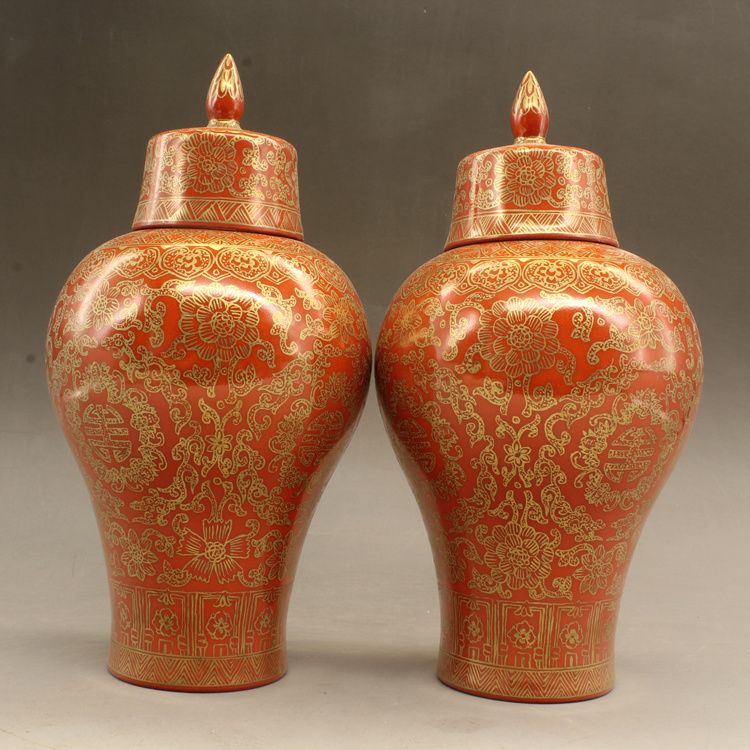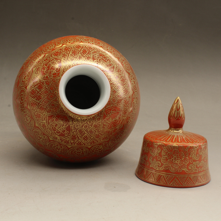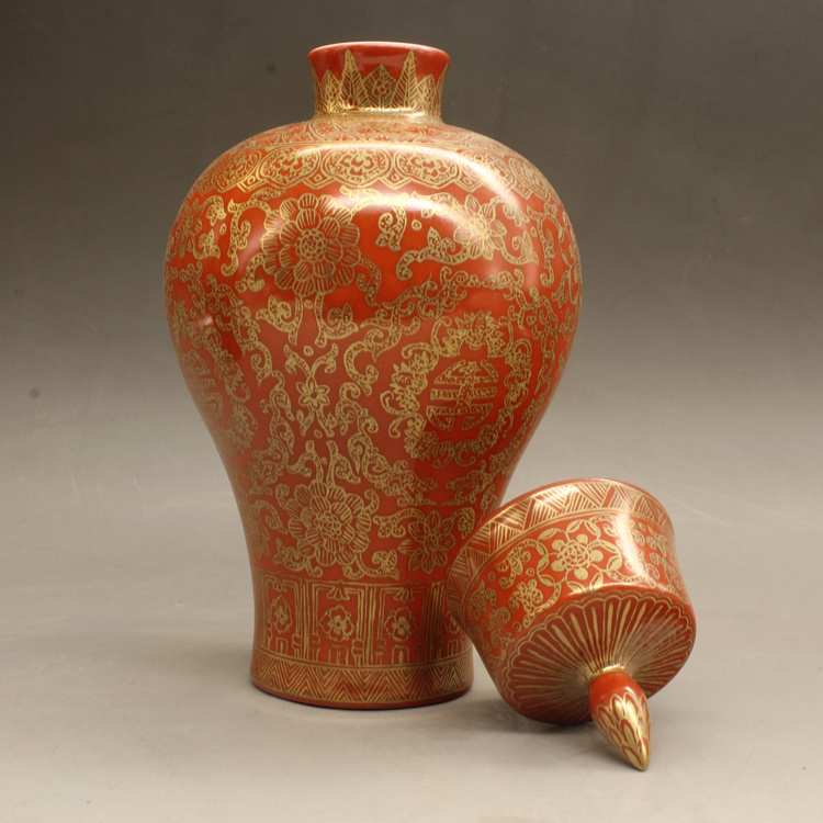 清乾隆紅釉描金帶蓋梅瓶(一對)仿古擺件古玩瓷器老貨收藏送禮1入