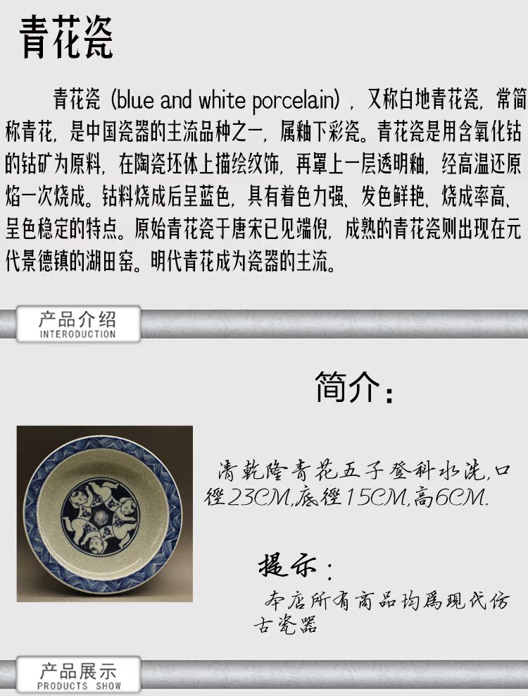 清乾隆青花五子登科天字水洗古玩古董仿古瓷做舊擺件收藏1入