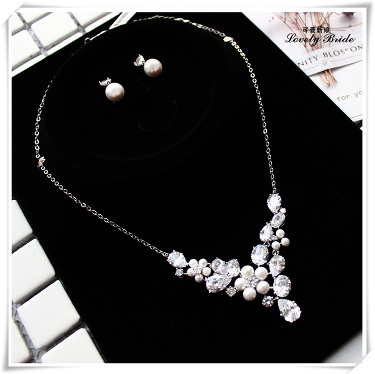 高端皓石珍珠清新娘項鏈耳環套裝耳夾婚紗禮服配飾品