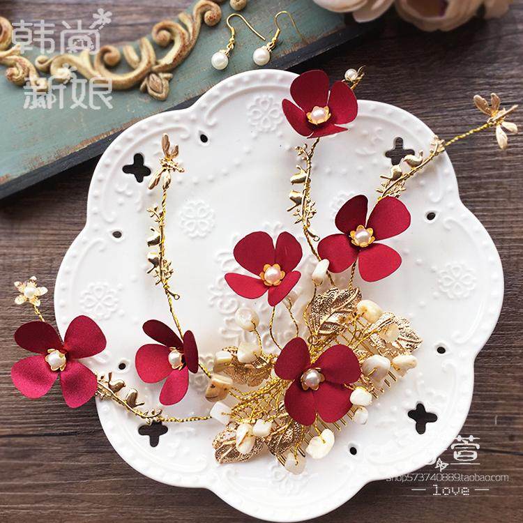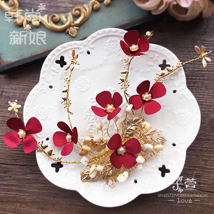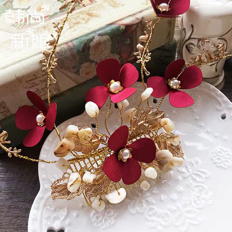 高貴大氣酒紅色新娘頭花金色結婚頭飾花朵梳子發飾婚紗禮服配飾品