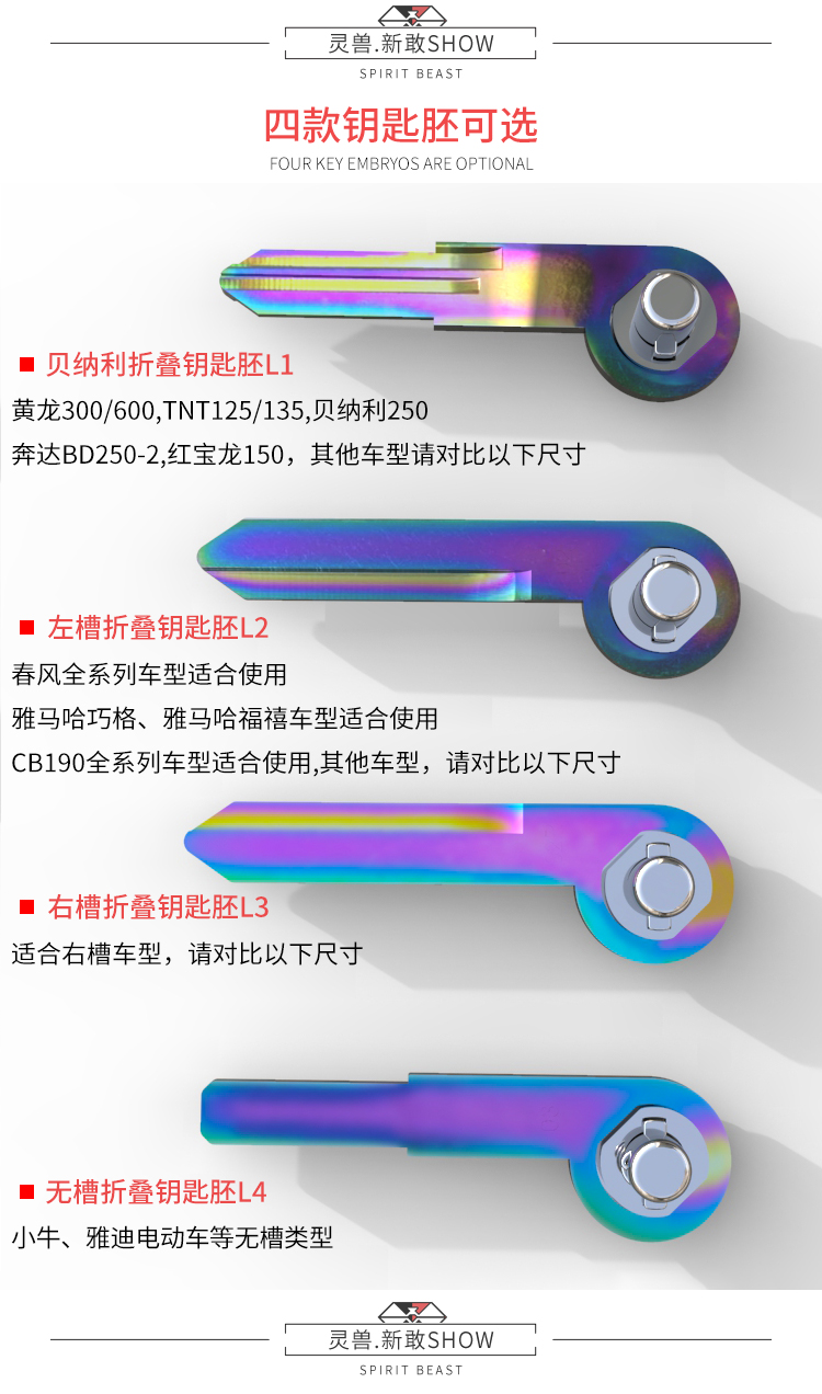 產品名稱:貝納利鑰匙頭 產品材質:T6063國標鋁合金 鑰匙胚L1:適合貝納利鑰匙 鑰匙胚L2:適合春風全系列車型,雅馬哈巧格/福禧100,CB190全系列車型/GS125/立馬閃電GT街跑版/天鷹牌TY150T-5/小猴子M3 鑰匙胚L3:適合鑰匙胚為右槽的車型,請對比尺寸 鑰匙胚L4:適合小牛、雅迪電動車等無槽類型 鑰匙殼顏色:紅黑,銀黑,全黑,燒藍 鑰匙胚顏色:鍍彩 產品特性:無需額外上套,加厚4mm,超凡手感,一按即彈,不卡頓 產品數量:1個 注意事項:鑰匙胚需要回去開齒才能使用,顏色會因環境光量以及角度不一樣,會導致圖片與實物有所偏差!請諒解,謝謝