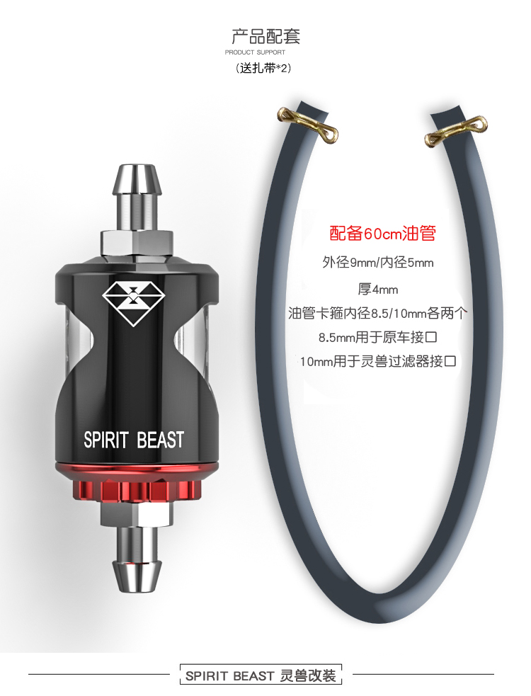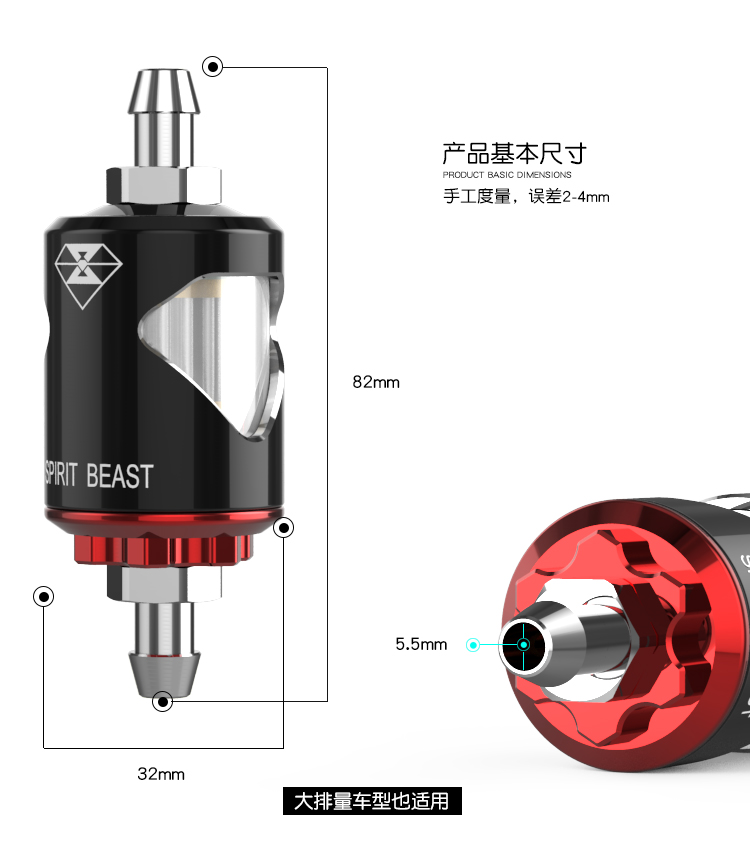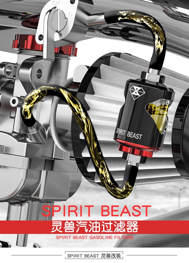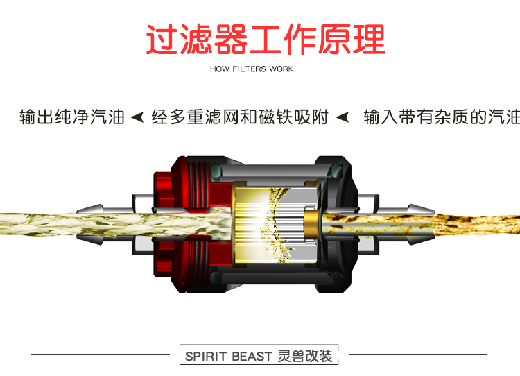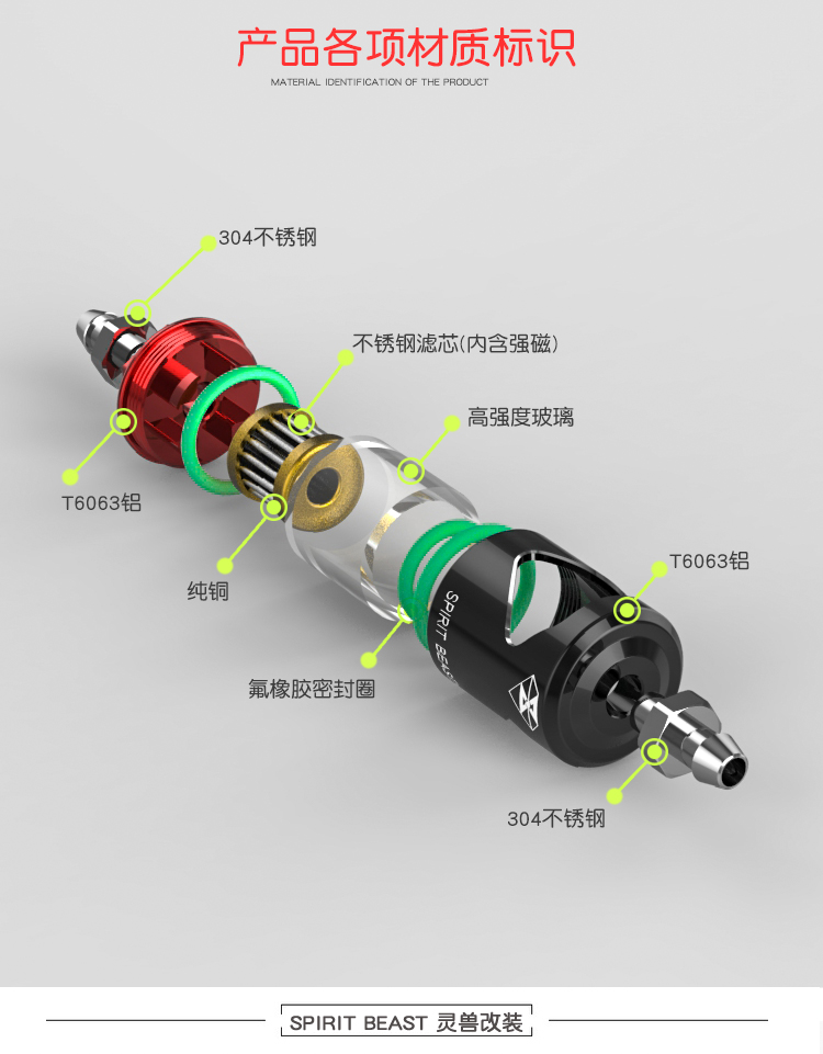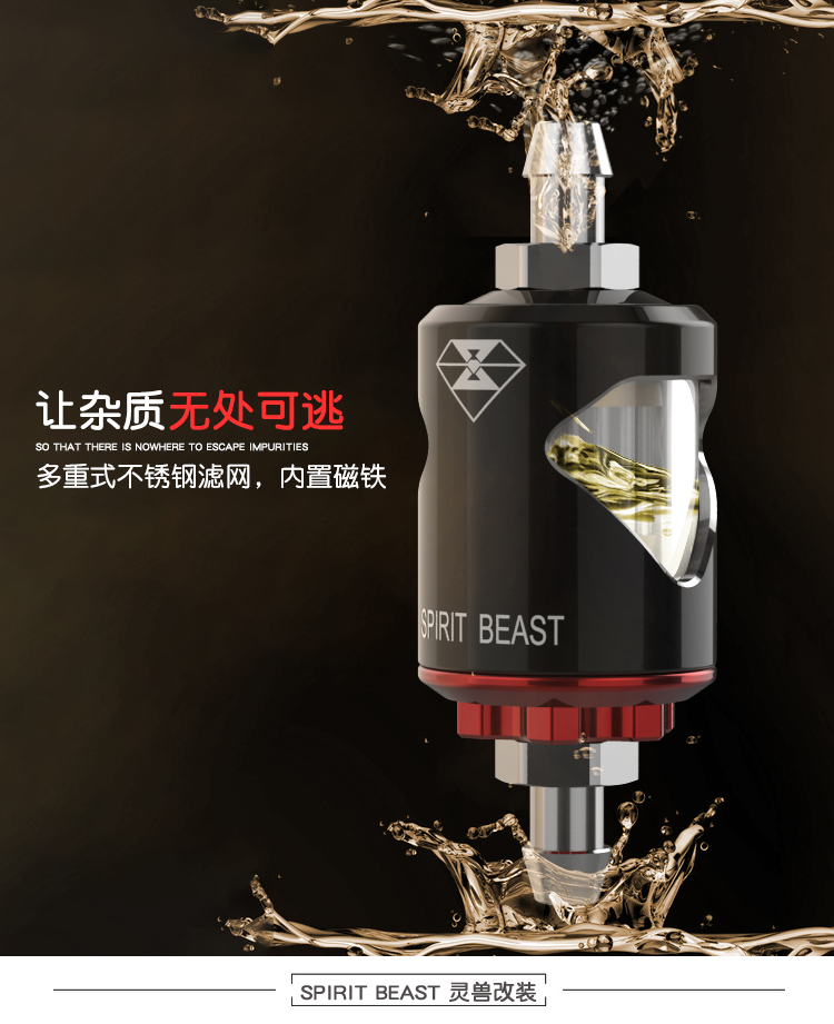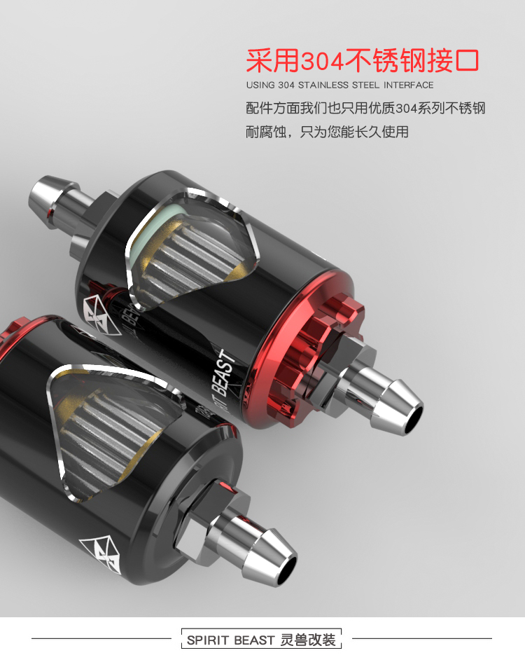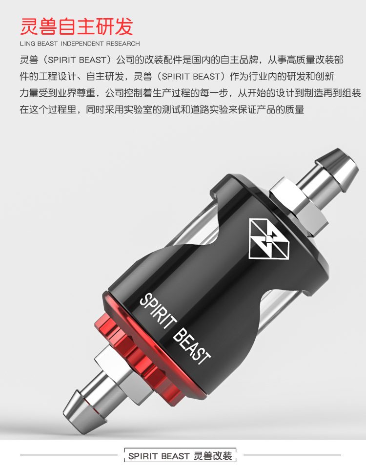 產品特點:靈獸新一代汽油過濾器,外殼T6063鋁制造,304不銹鋼油嘴,長久耐用,不銹鋼強磁濾芯,保護引擎防止雜質受損