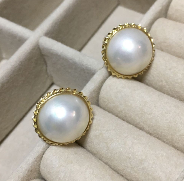 18K馬貝珍珠耳釘麻花邊13-14mm5A強光無暇珍珠耳釘耳墜1入