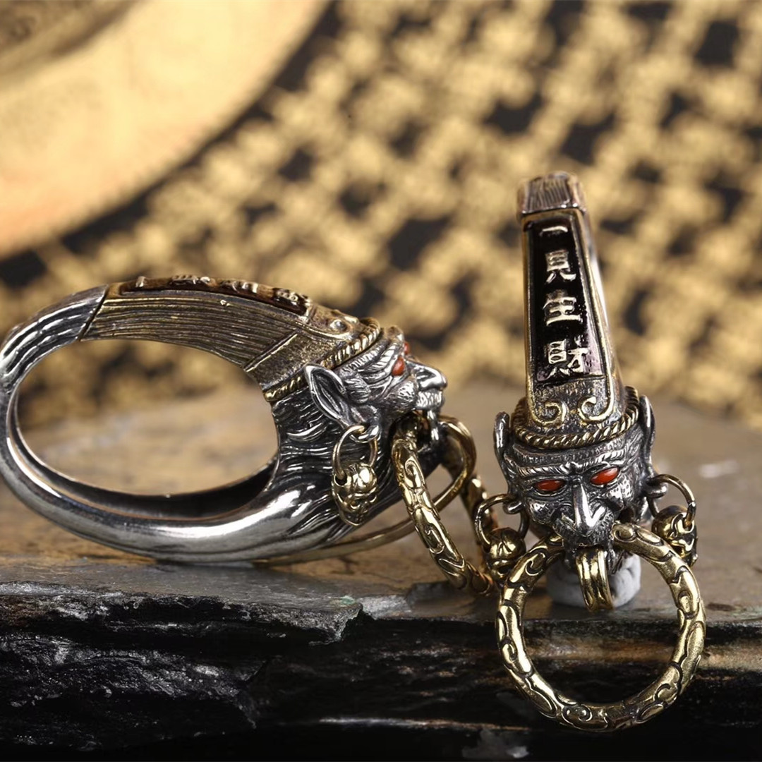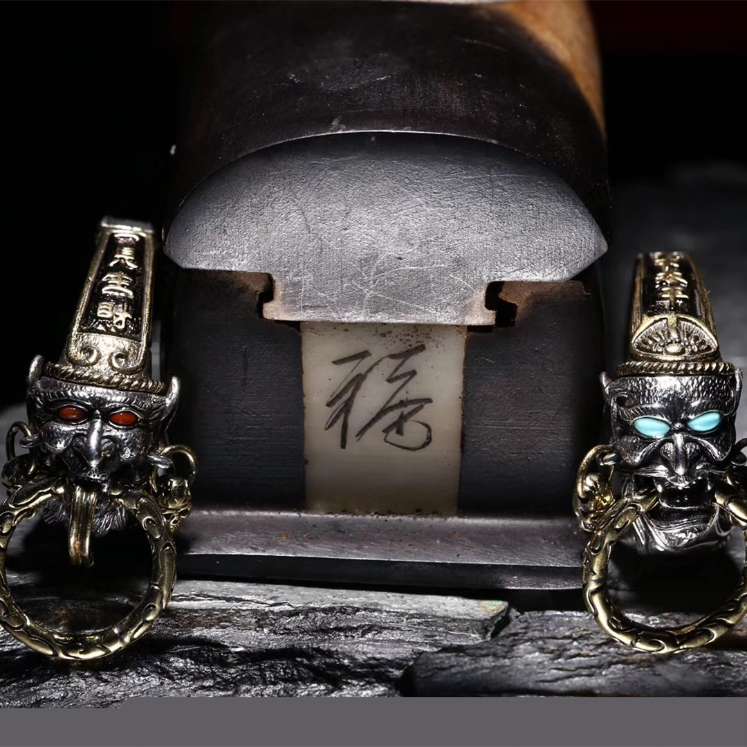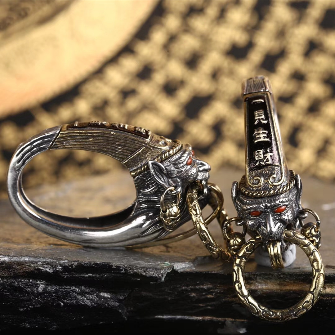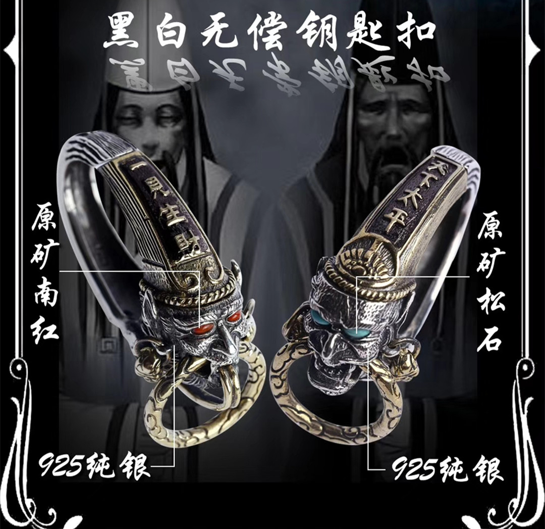黑白無常.天下太平.一見生財眼睛手工精鑲原礦湖北松石南紅鑰匙扣 掛飾!黑白無常華夏民族之魂!s925純銀鑄造 金色部分純銅原色不用擔心掉色 尺寸:42x28x14 每件24克左右!可以包掛 掛飾 鑰匙扣 鎮宅 安家 庇佑 招財!