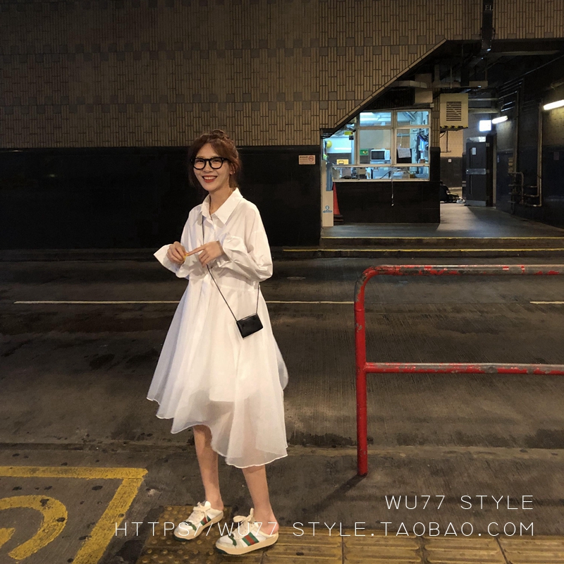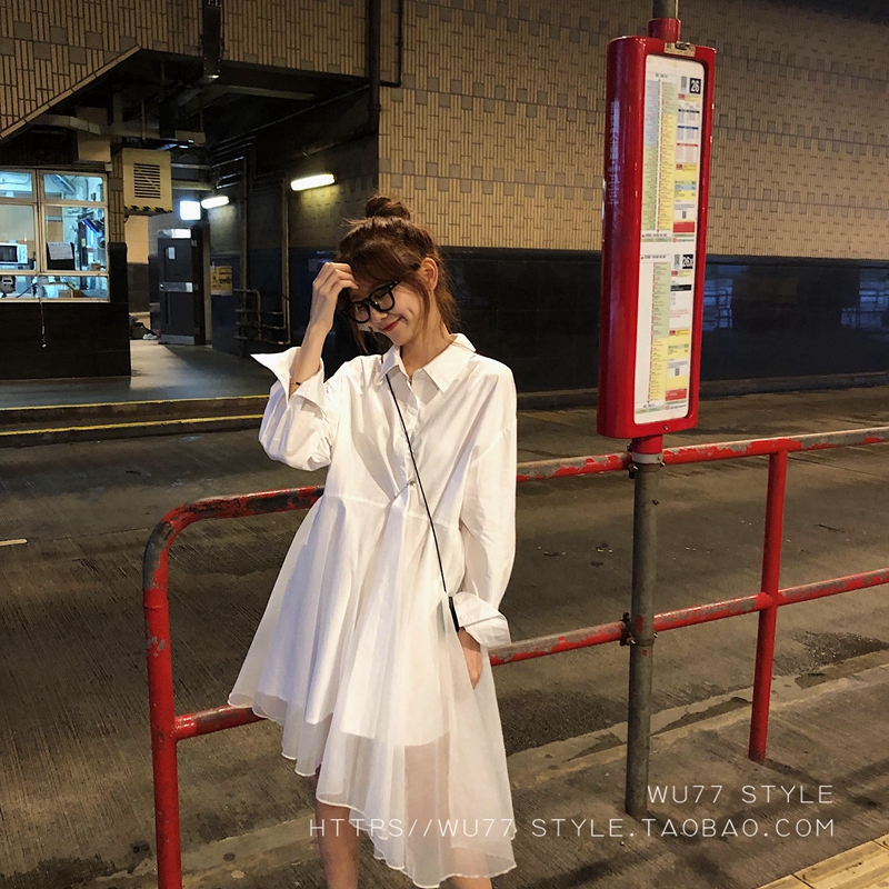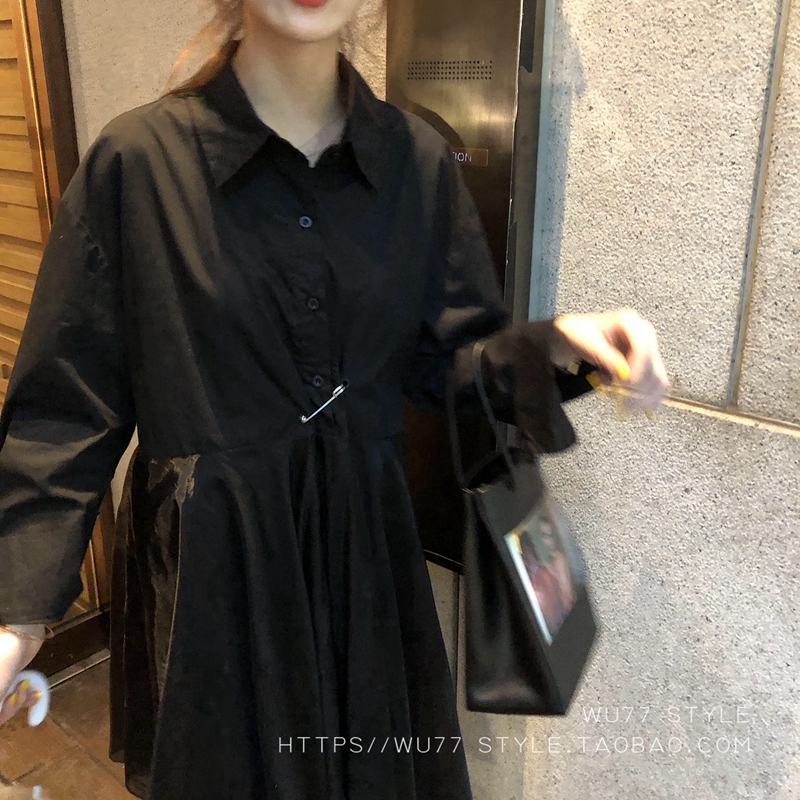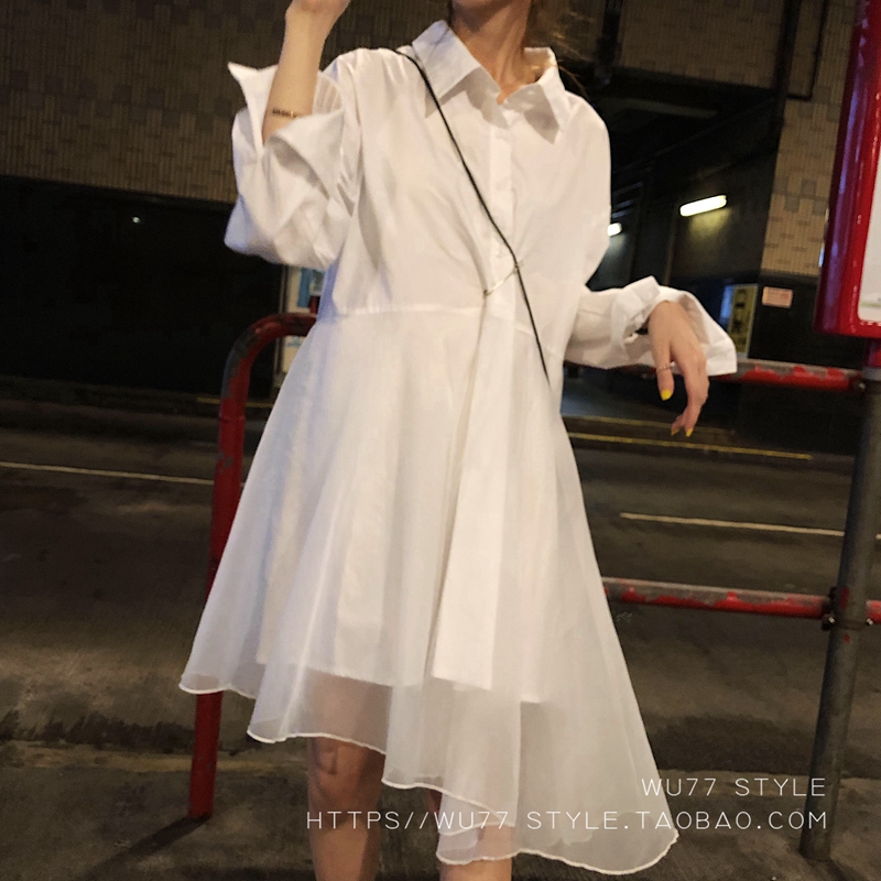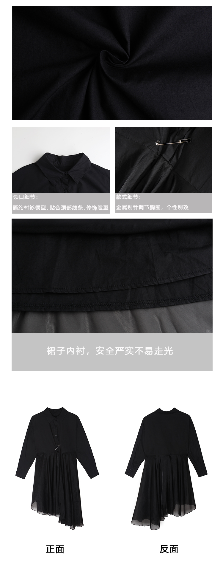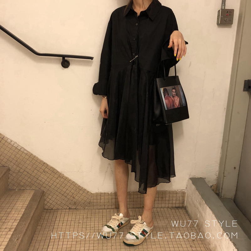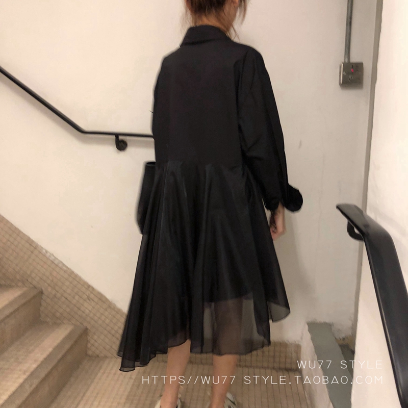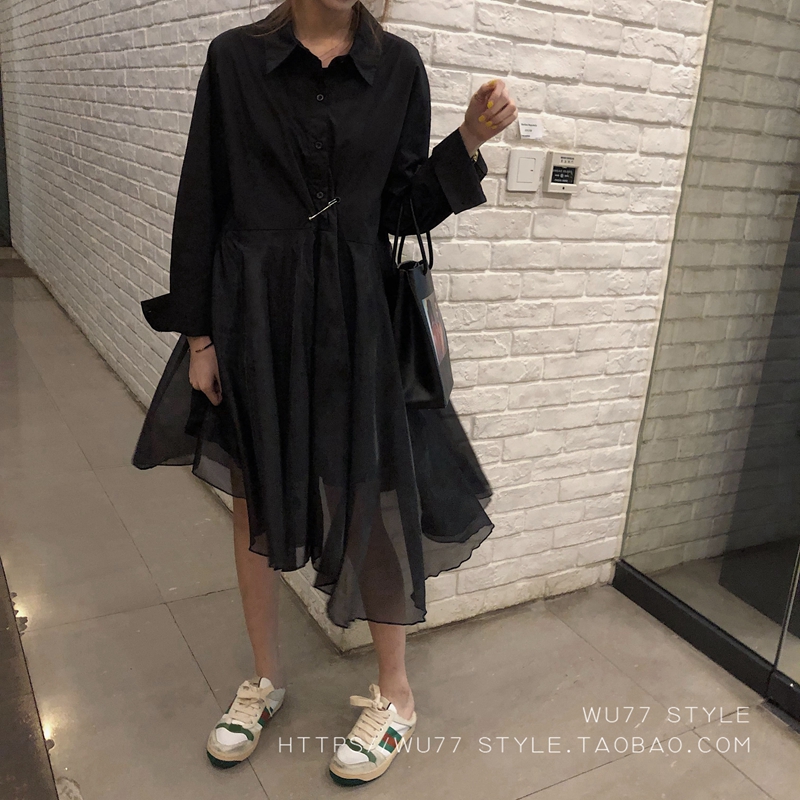 烏77設計感拼接網紗襯衫裙韓版寬松顯瘦不規則大擺連衣裙女秋20191入