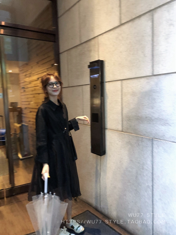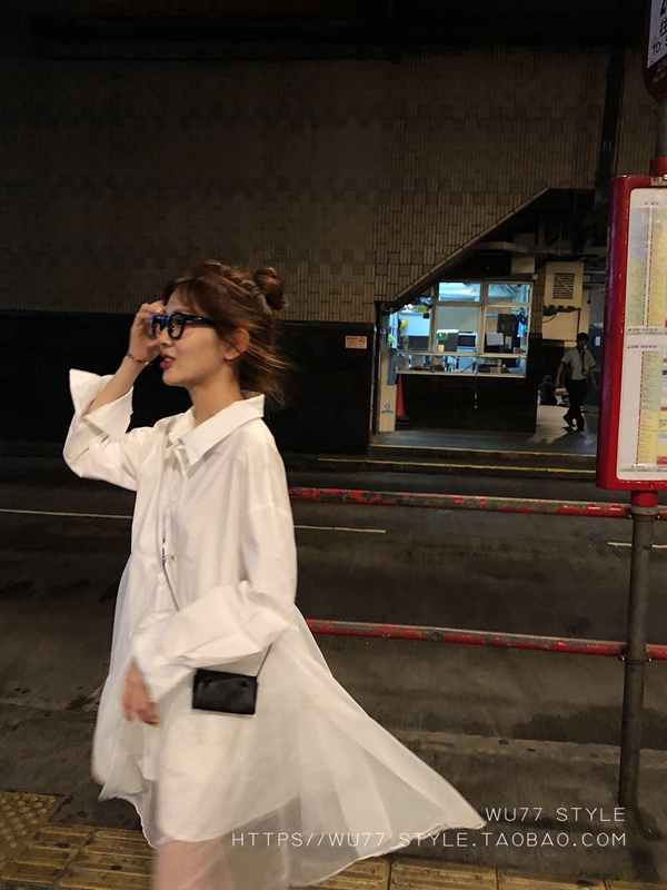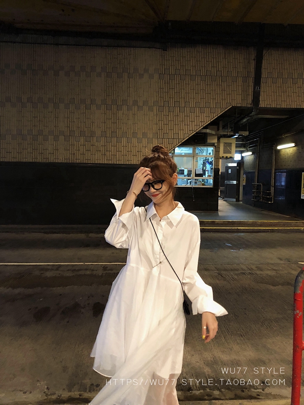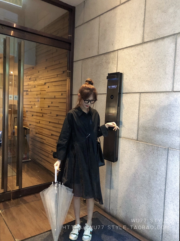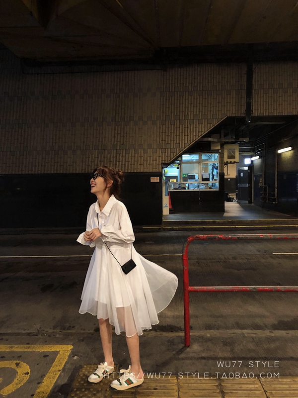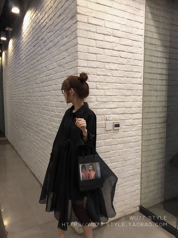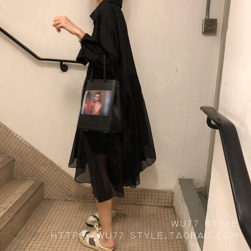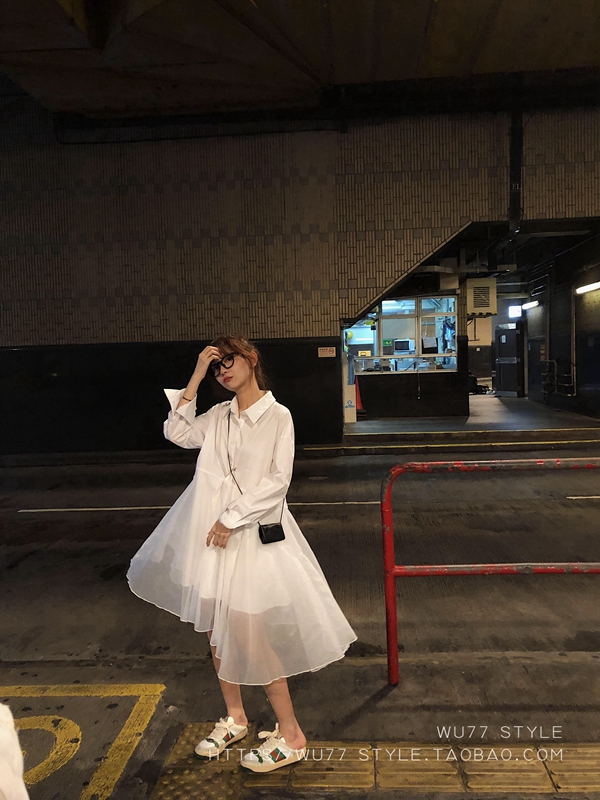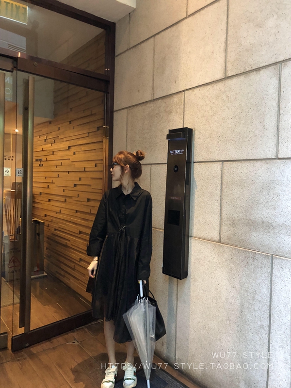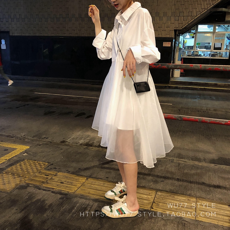 烏77設計感拼接網紗襯衫裙韓版寬松顯瘦不規則大擺連衣裙女秋20191入